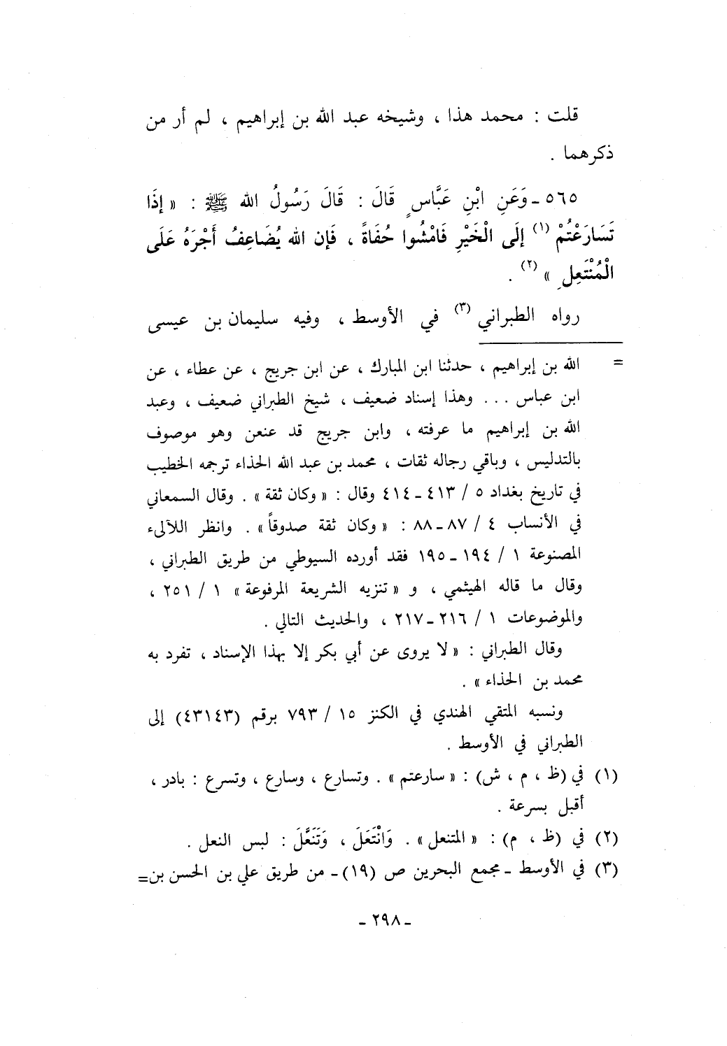 565 - وَعَنِ ابْنِ عَبَّاسٍ قَالَ: قَالَ رَسُول الله - صلى الله عليه وسلم -: "إذَا تَسَارَعْتُمْ (¬1) إلَى الْخَيْرِ فَامْشُوا حُفَاةً، فَإن الله يُضَاعِفُ أَجْرَهُ عَلَى الْمُنْتَعِلَ" (¬2).