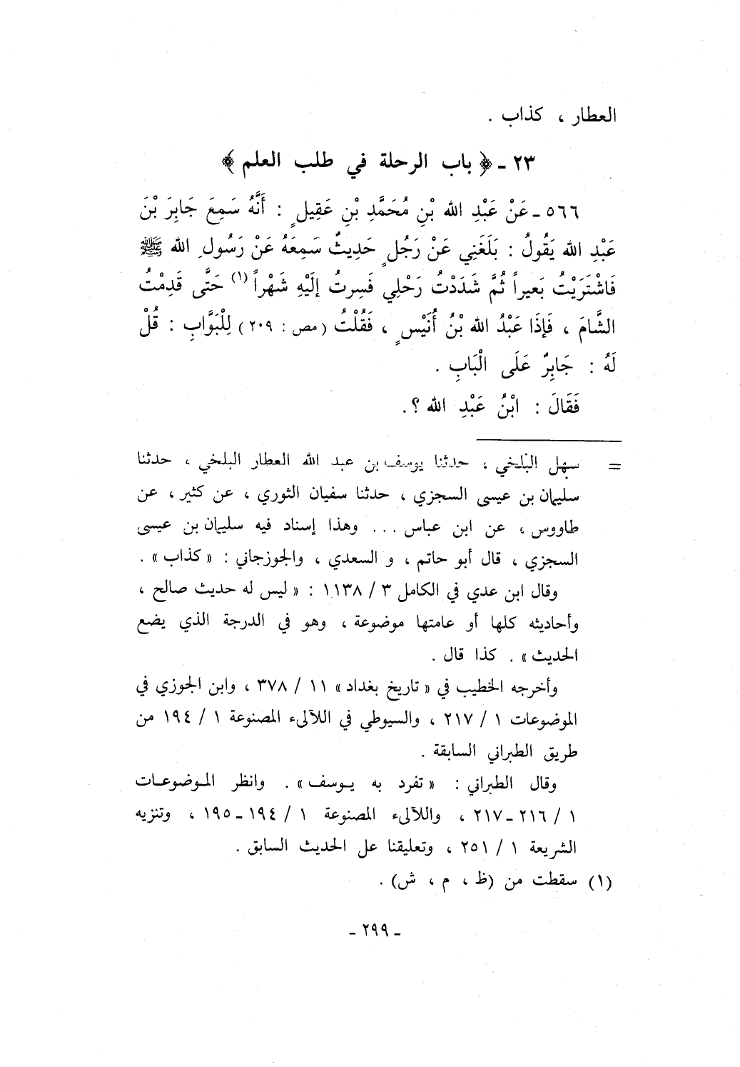 566 - عَنْ عَبْدِ الله بْنِ مُحَمَّدِ بْنِ عَقِيلٍ: أَنَّهُ سَمِعَ جَابِرَ بْنَ عَبْدِ الله يَقُولُ: بَلَغَنِي عَنْ رَجُلٍ حَدِيثٌ سَمِعَهُ عَنْ رَسُولِ الله - صلى الله عليه وسلم - فَاشْتَرَيْتُ بَعيراً ثُمَّ شَدَدْتُ رَحْلِي فَسِرتُ إلَيْهِ شَهْراً (¬1) حَتَّى قَدِمْتُ الشَّامَ، فَإذَا عَبْدُ الله بْنُ أُنَيْسٍ، فَقُلْتُ (مص: 209) لِلْبَوَّابِ: قُلْ لَهُ: جَابِرٌ عَلَى الْبَابِ.