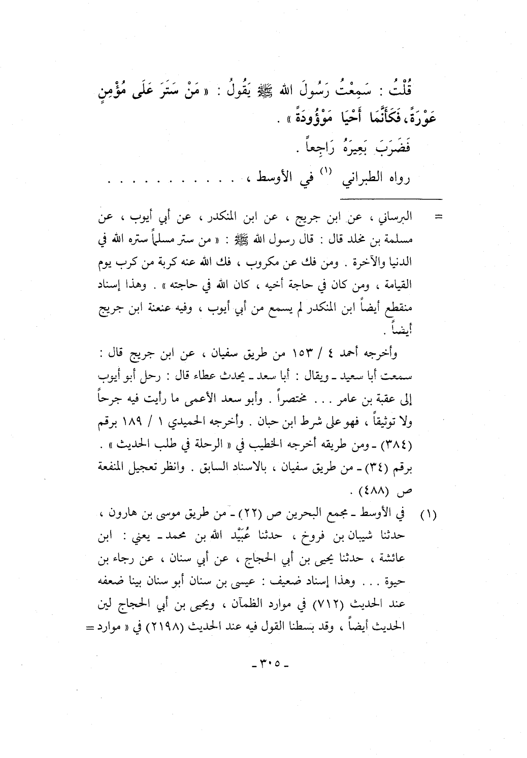 = البرساني، عن ابن جريج، عن ابن المنكدر، عن أبي أيوب، عن مسلمة بن مخلد قال: قال رسول الله - صلى الله عليه وسلم -: "من ستر مسلماً ستره الله في الدنيا والآخرة. ومن فك عن مكروب، فك الله عنه كربة من كرب يوم القيامة، ومن كان في حاجة أخيه، كان الله في حاجته". وهذا إسناد منقطع أيضاً ابن المنكدر لم يسمع من أبي أيوب، وفيه عنعنة ابن جريج أيضاً.