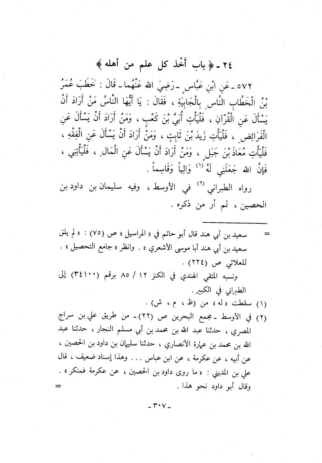 572 - عَنْ ابْنِ عَبَّاسٍ -رَضِيَ الله عَنْهما- قَالَ: خَطَبَ عُمَرُ بْنُ الْخَطَّابِ النَّاسِ بِالْجَابِيَةِ، فَقَالَ: يَا أَيُّهَا النَّاسُ مَنْ أَرَادَ أَنْ يَسْأَلَ عَنِ الْقُرْآنِ، فَلْيَأْتِ أُبَيَّ بْنَ كَعْبٍ، وَمَنْ أَرَادَ أَنْ يَسْأَلَ عَنِ الْفَرَائِضِ، فَلْيَأْتِ زَيدَ بْنَ ثَابِتٍ، وَمَنْ أَرَادَ أَنْ يَسْأَلَ عَنِ الْفِقْهِ، فَلْيَأْتِ مُعَاذَ بْنَ جَبَلٍ، وَمَنْ أَرَادَ أَنْ يَسْأَلَ عَنِ الْمَالِ، فَلْيَأْتِنِي، فَإنَّ الله جَعَلَنِي لَهُ (¬1) وَالِياً وَقَاسِمًا.