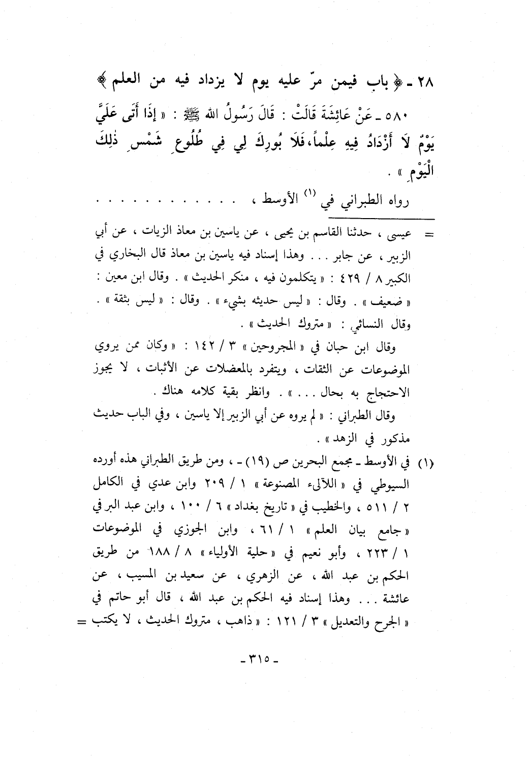 580 - عَنْ عَائِشَةَ قَالَتْ: قَالَ رَسُولُ الله - صلى الله عليه وسلم -: "إذَا أَتَى عَلَيَّ يَوْمٌ لا أَزْدَادُ فِيهِ عِلْماً، فَلاَ بُورِكَ لِي في طُلُوعِ شَمْسِ ذَلِكَ الْيَوْمَ".