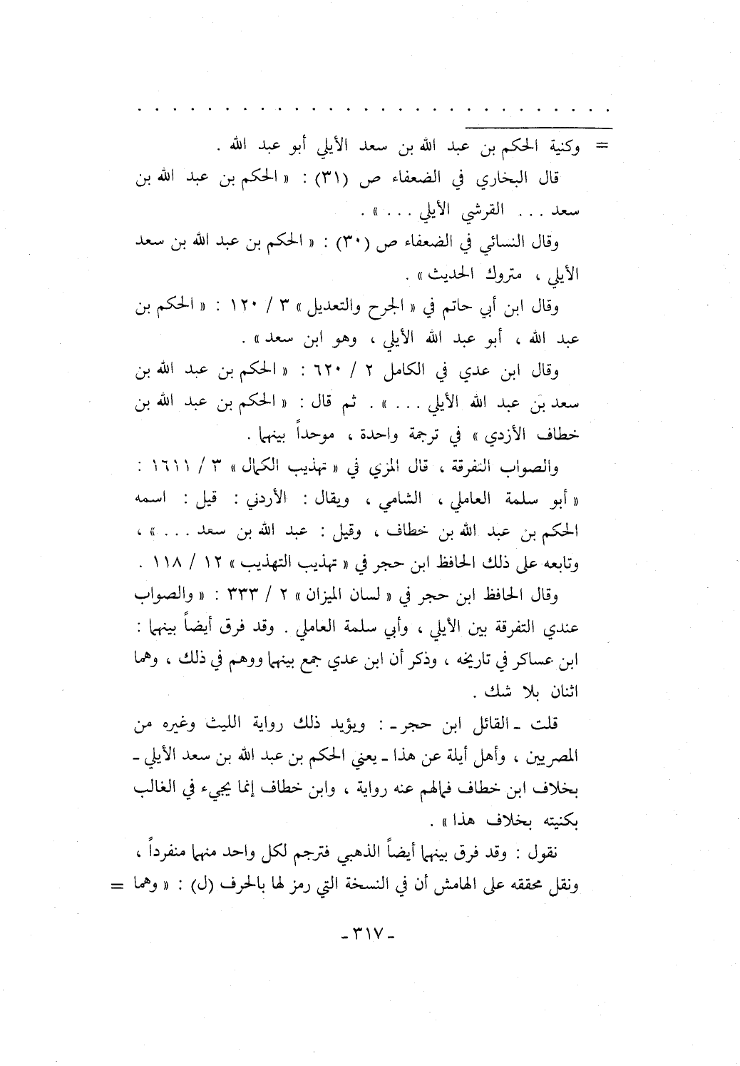وقال ابن عدي في الكامل 2/ 620: "الحكم بن عبد الله بن سعد بن عبد الله الأيلي ... ". ثم قال: "الحكم بن عبد الله بن خطاف الأزدي" في ترجمة واحدة، موحداً بينهما.