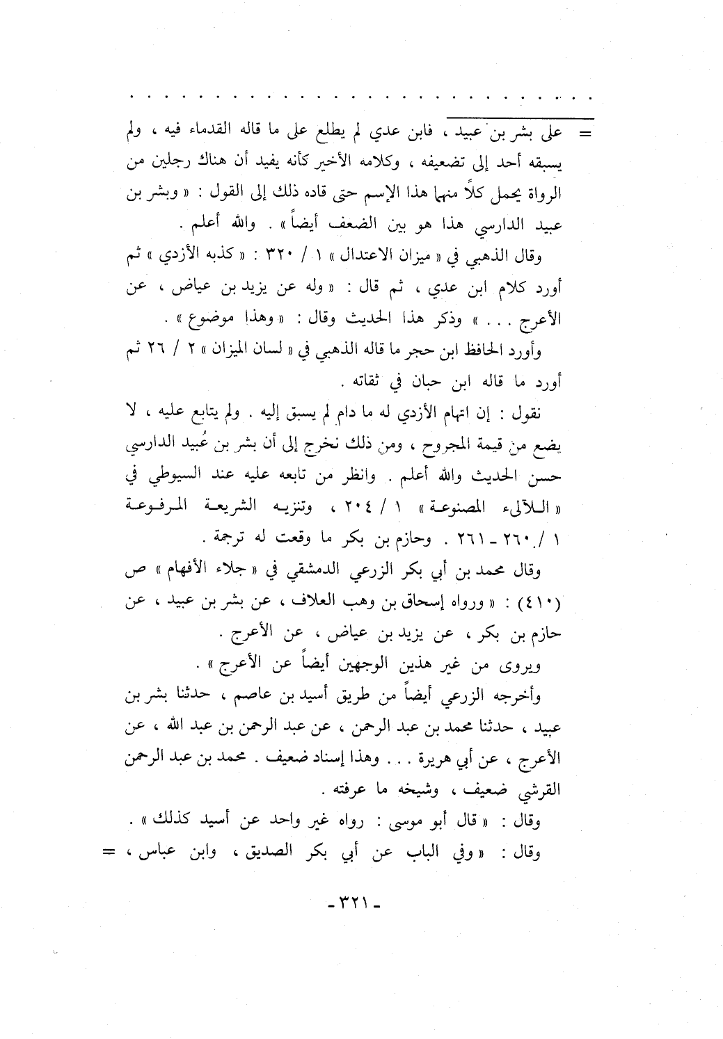 = على بشر بن عبيد، فابن عدي لم يطلع على ما قاله القدماء فيه، ولم يسبقه أحد إلى تضعيفه، وكلامه الأخير كأنه يفيد أن هناك رجلين من الرواة يحمل كلاً منهما هنا الإسم حتى قاده ذلك إلى القول: "وبشر بن عبيد الدارمي هذا هو بين الضعف أيضاً". والله أعلم.