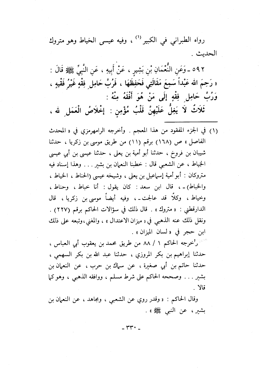 592 - وَعَنِ النُّعْمَانِ بْنِ بَشِيرٍ، عَنْ أَبِيهِ، عَنِ النَّبِيِّ - صلى الله عليه وسلم - قَالَ: "رَحِمَ الله عَبْداً سَمِعَ مَقَالَتِي َفحَفِظَهَا، فَرُبَّ حَامِلِ فِقْهٍ غَيْرُ فَقْيهٍ، وَرُبَّ حَامِلِ فِقْهٍ إلَى مَنْ هُوَ أَفْقَهُ مِنْهُ: