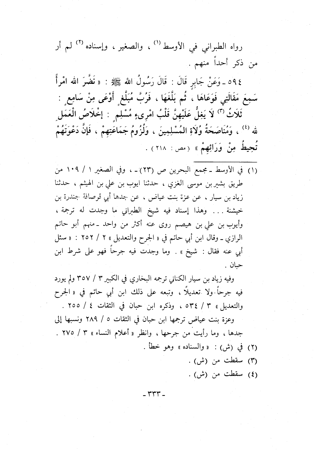 594 - وَعَنْ جَابِرٍ قَالَ: قَالَ رَسُولُ الله - صلى الله عليه وسلم -: "نَضَّرَ الله امْرأً سَمِعَ مَقَالَتِي فَوَعَاهَا، ثُم بَلَّغَهَا، فَرُبَّ مُبَلَّغٍ أَوْعَى مِنْ سَامِعٍ: