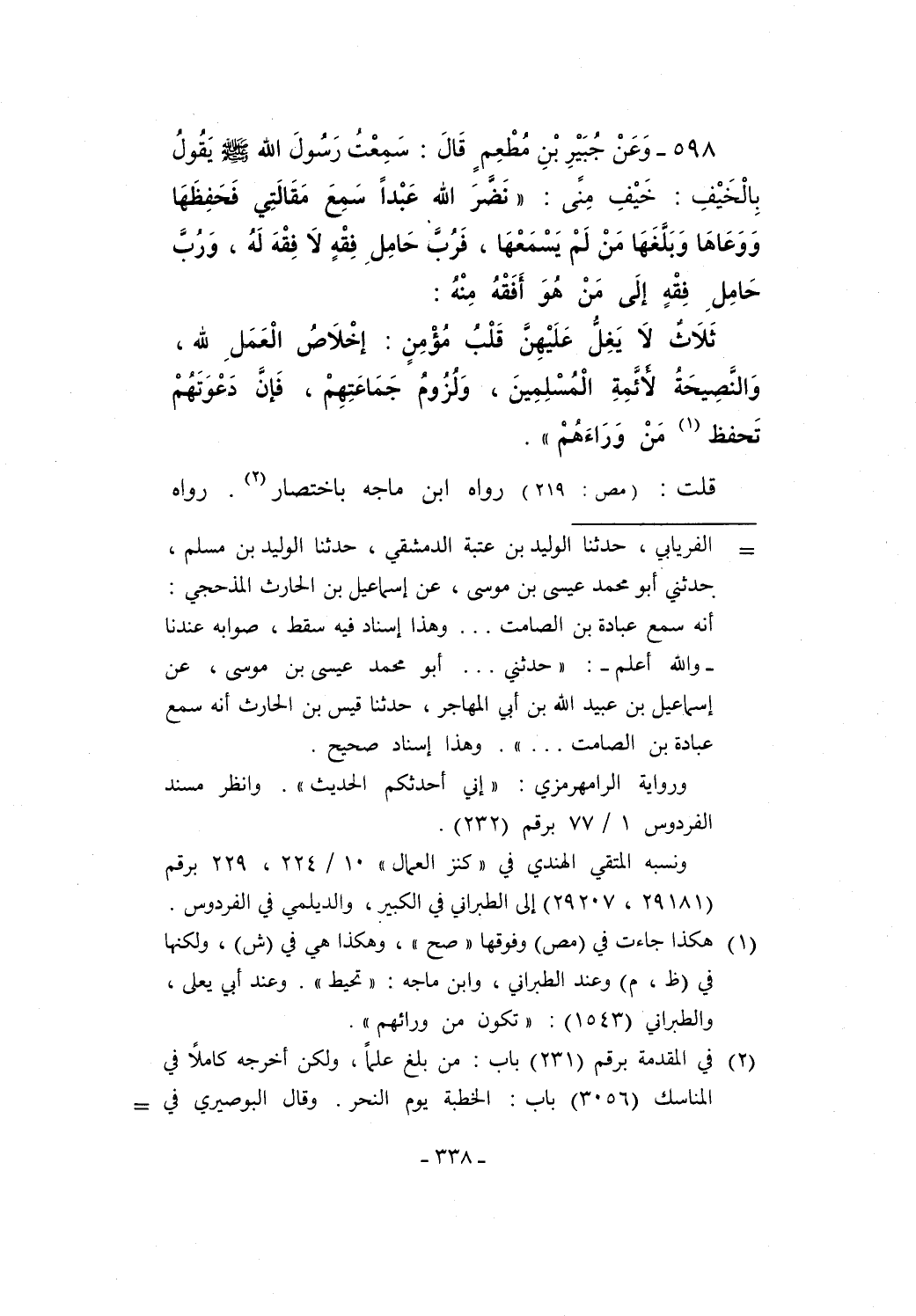 598 - وَعَنْ جُبَيْرِ بْنِ مُطْعِمٍ قَالَ: سَمِعْتُ رَسُولَ الله - صلى الله عليه وسلم - يَقُولُ بِالْخَيْفِ: خَيْفِ مِنًى: "نَضَّرَ الله عَبْداً سَمِعَ مَقَالَتِي فَحَفِظَهَا وَوَعَاهَا وَبَلَّغَهَا مَنْ لَمْ يَسْمَعْهَا، فَرُبَّ حَامِلِ فِقْهٍ لاَ فِقْهَ لَهُ، وَرُبَّ حَامِلِ فِقْهٍ إلَى مَنْ هُوَ أَفَقْهُ مِنْهُ: