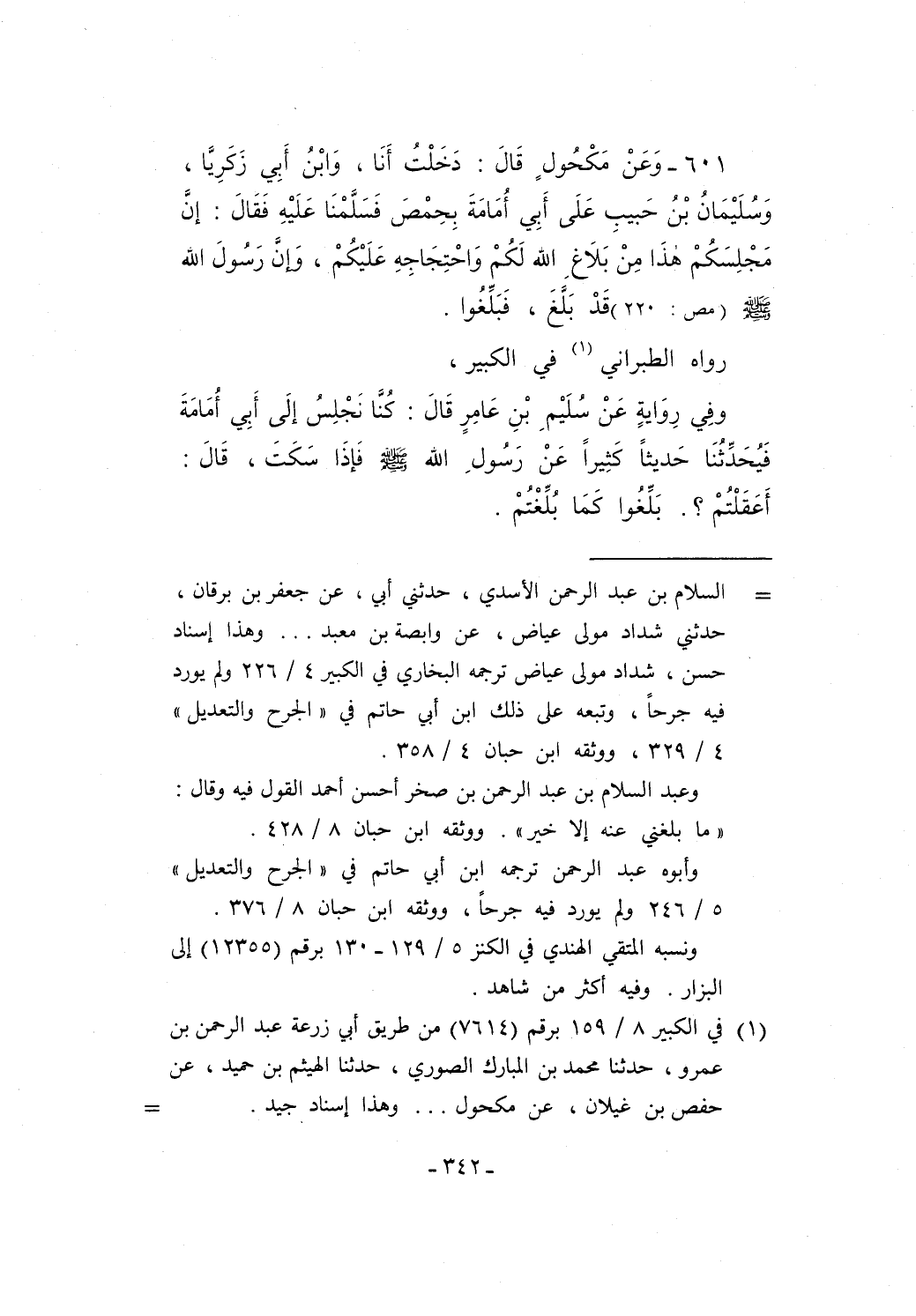 601 - وَعَنْ مَكْحُولٍ قَالَ: دَخَلْتُ أَنَا، وَابْنُ أَبِي زَكَرِيَّا، وَسُلَيْمَانُ بْنُ حَبيبِ عَلَى أَبِي أُمَامَةَ بِحِمْصَ فَسَلَّمْنَا عَلَيْهِ فَقَالَ: إنَّ مَجْلِسَكُمْ هَذَا مِنْ بَلاَغِ الله لَكُمْ وَاحْتِجَاجِهِ عَلَيْكُمْ، وَإِنَّ رَسُولَ الله - صلى الله عليه وسلم - (مص: 220) قَدْ بَلَّغَ، فَبَلِّغُوا.