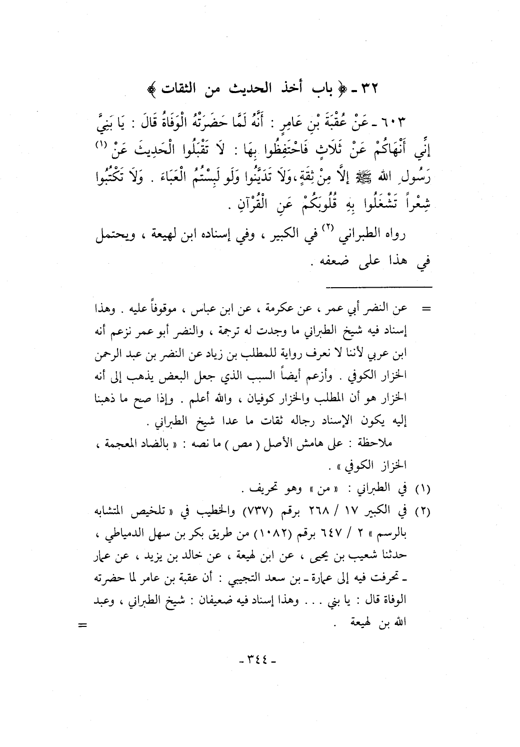 603 - عَنْ عُقْبَةَ بْنِ عَامِرٍ: أَنَّهُ لَمَّا حَضرَتْهُ الْوَفَاةُ قَالَ: يَا بَنِيَّ إنِّي أَنْهَاكُمْ عَنْ ثَلاَثٍ فَاحْتَفِظُوا بِهَا: لاَ تَقْبَلُوا الْحَدِيثَ عَنْ (¬1) رَسُولِ الله - صلى الله عليه وسلم - إلاَّ مِنْ ثِقَةٍ، وَلاَ تَدَيَّنُوا وَلَو لَبِسْتُمُ الْعَبَاءَ. وَلاَ تَكْتُبُوا شِعْراً تَشْغَلُوا بِهِ قُلُوبَكُمْ عَنِ الْقُرْآنِ.