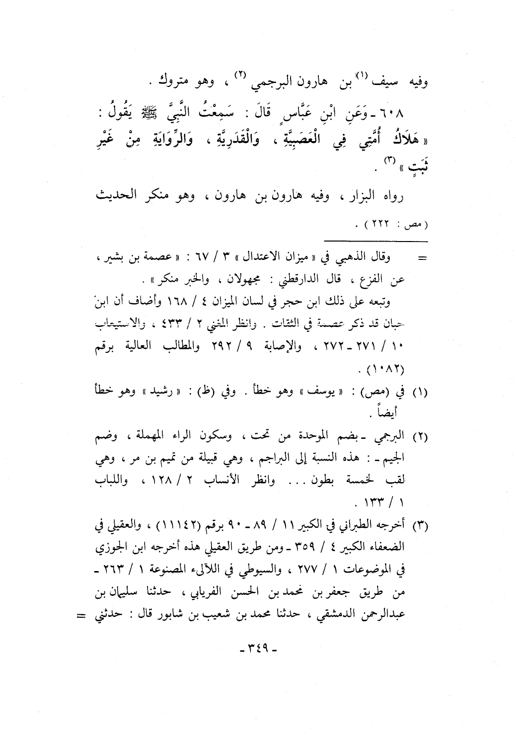 608 - وَعَنِ ابْنِ عَبَّاسٍ قَالَ: سَمِعْتُ النَّبِيَّ - صلى الله عليه وسلم - يَقُولُ: "هَلاَكُ أُمَّتِي في الْعَصَبِيَّةِ، وَالْقَدَرِيَّةِ، وَالرِّوَايَةِ مِنْ غَيْرِ ثَبَتٍ" (¬3).