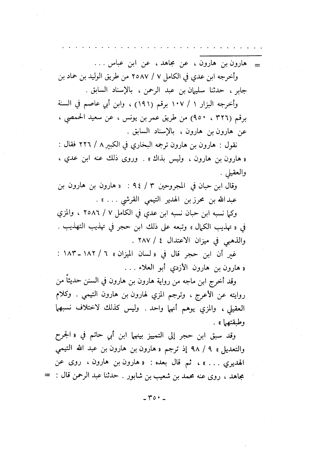 وقد أخرج ابن ماجه من رواية هارون بن هارون في السنن حديثاً من روايته عن الأعرج، وترجم المزي لهارون بن هارون التيمي. وكلام العقيلي، والمزي يوهم أنهما واحد. وليس كذلك لاختلاف نسبهما وطبقتهما".