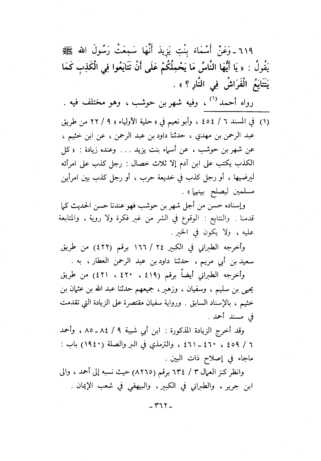 619 - وَعَنْ أَسْمَاءَ بِنتِ يَزِيدَ أَنَّهَا سَمِعْتَ رَسُولَ الله - صلى الله عليه وسلم - يَقُولُ: "يَا أَيُّهَا النَّاسُ مَا يَحْمِلُكُمْ عَلَى أَنْ تَتَايَعُوا في الْكَذِبِ كَمَا يَتَتَايَعُ الْفَرَاشُ في النَّارِ؟ ".
