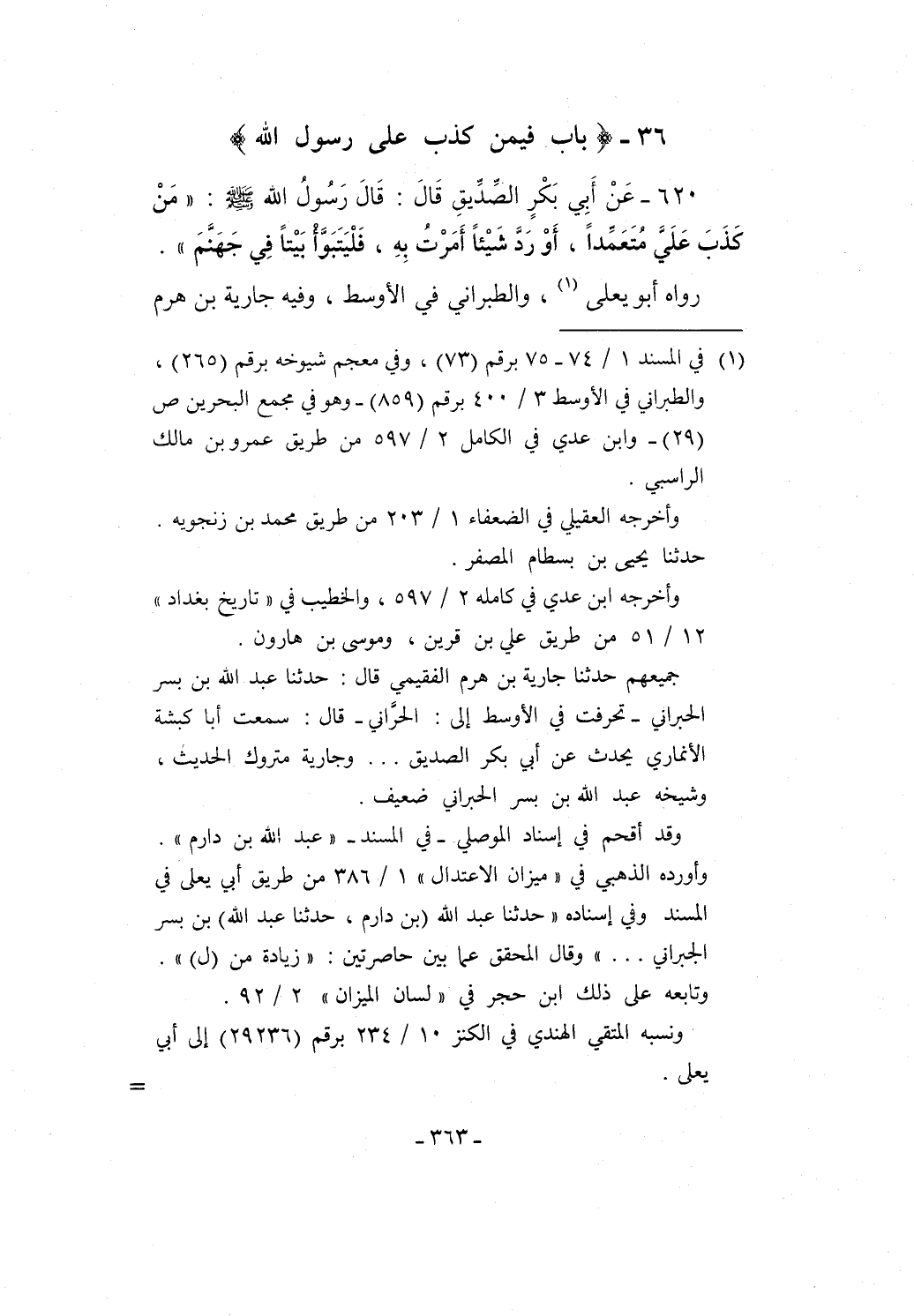 620 - عَنْ أَبِي بَكْرٍ الصدِّيقِ قَالَ: قَالَ رَسُولُ الله - صلى الله عليه وسلم -: "مَنْ كَذَبَ عَلَيَّ مُتَعَمِّداً، أَوْ رَدَّ شَيْئاً أَمَرْتُ بِهِ، فَلْيَتَبَوَّأ بَيْتاً في جَهَنَمَ".