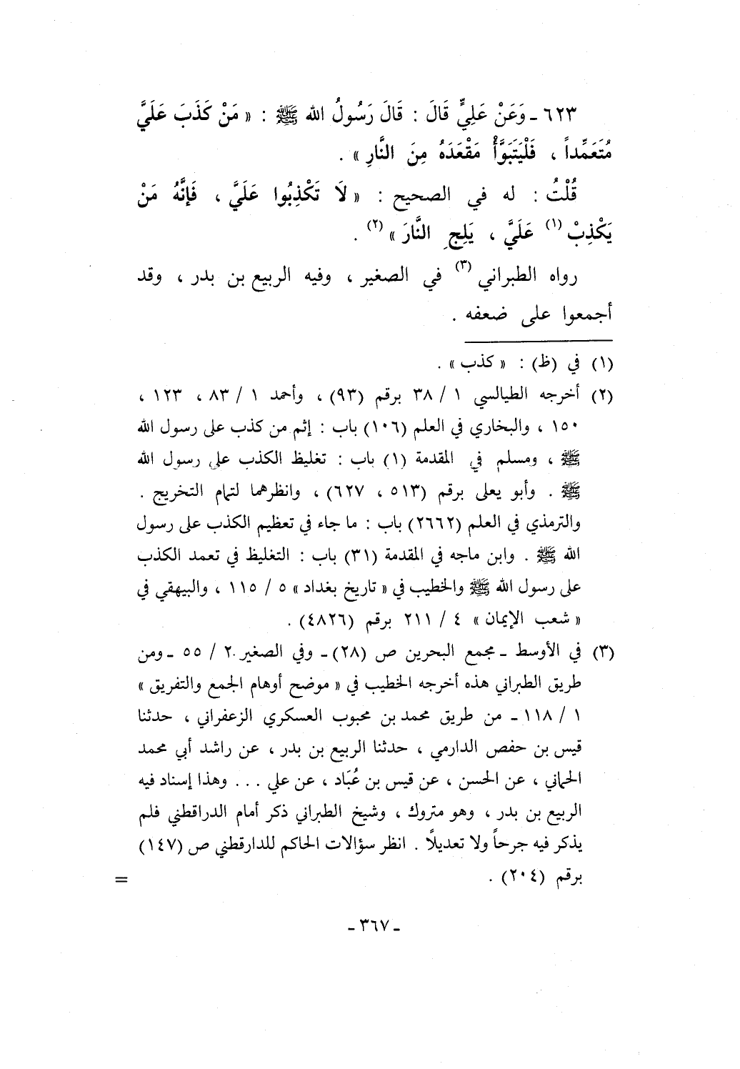 (¬2) أخرجه الطيالسي 1/ 38 برقم (93)، وأحمد 1/ 83، 123، 150، والبخاري في العلم (106) باب: إثم من كذب على رسول الله - صلى الله عليه وسلم -، ومسلم في المقدمة (1) باب: تغليظ الكذب على رسول الله - صلى الله عليه وسلم -. وأبو يعلى برقم (513، 627)، وانظرهما لتمام التخريج.