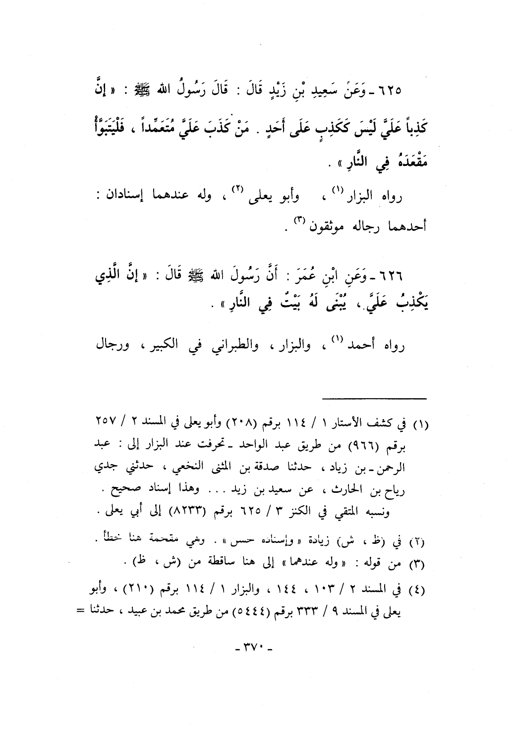 625 - وَعَن سَعِيدِ بْنِ زَيْدٍ قَالَ: قَالَ رَسُولُ الله - صلى الله عليه وسلم -: "إِنَّ كَذِباً عَلَيَّ لَيْسَ كَكَذِبٍ عَلَى أَحَدٍ. مَنْ كَذَبَ عَلَيَّ مُتَعَمِّداً، فَلْيَتَبَوَّأ مَقْعَدَهُ في النَّارِ".