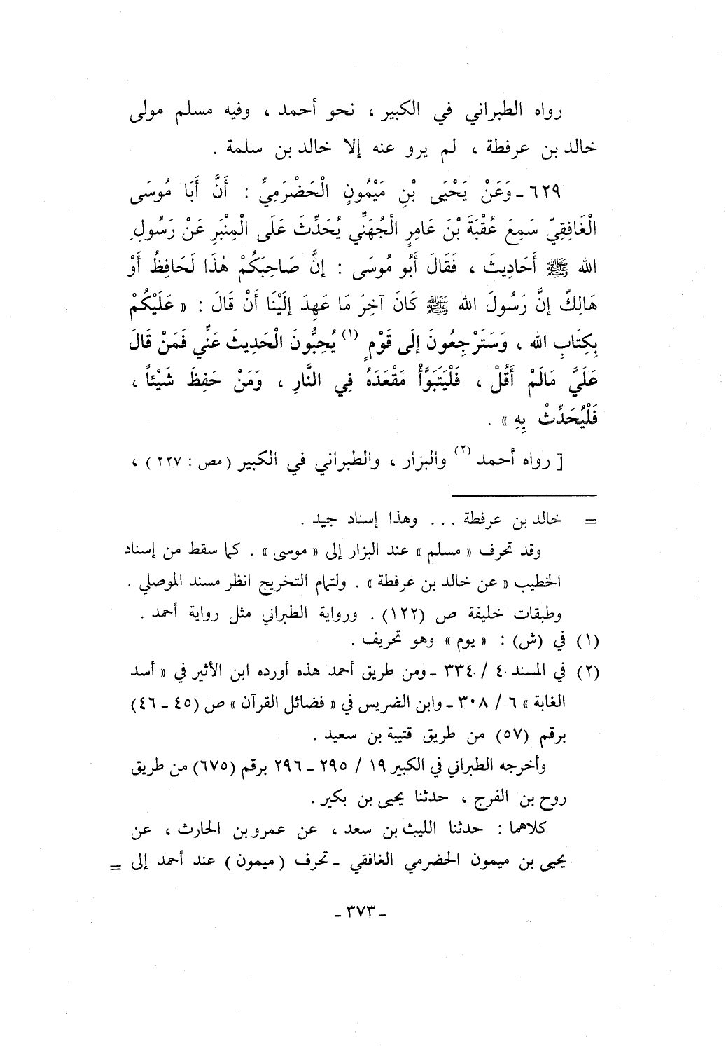 629 - وَعَنْ يَحْيَى بْنِ مَيْمُونٍ الْحَضْرَمِيِّ: أَنَّ أَبَا مُوسَى الْغَافِقِيّ سَمِعَ عُقْبَةَ بْنَ عَامِرٍ الْجُهَنِّي يُحَدِّثَ عَلَى الْمِنْبَرِ عَنْ رَسُولِ الله - صلى الله عليه وسلم - أحَادِيثَ، فَقَالَ أَبُو مُوسَى: إنَّ صَاحِبَكُمْ هذَا لَحَافِظُ أَوْ هَالِكٌ إنَّ رَسُولَ الله - صلى الله عليه وسلم - كَانَ آخِرَ مَا عَهِدَ إلَيْنَا أَنْ قَالَ: "عَلَيْكُمْ بِكِتَابِ الله، وَسَتَرْجِعُونَ إلَى قَوْمٍ (¬1) يُحِبُّونَ الْحَدِيثَ عَنِّي فَمَنْ قَالَ عَلَيَّ مَا لَمْ أَقُلْ، فَلْيَتَبَوَّأ مَقْعَدَهُ في النَّارِ، وَمَنْ حَفِظَ شَيْئاً، فَلْيُحَدِّثْ بِه".