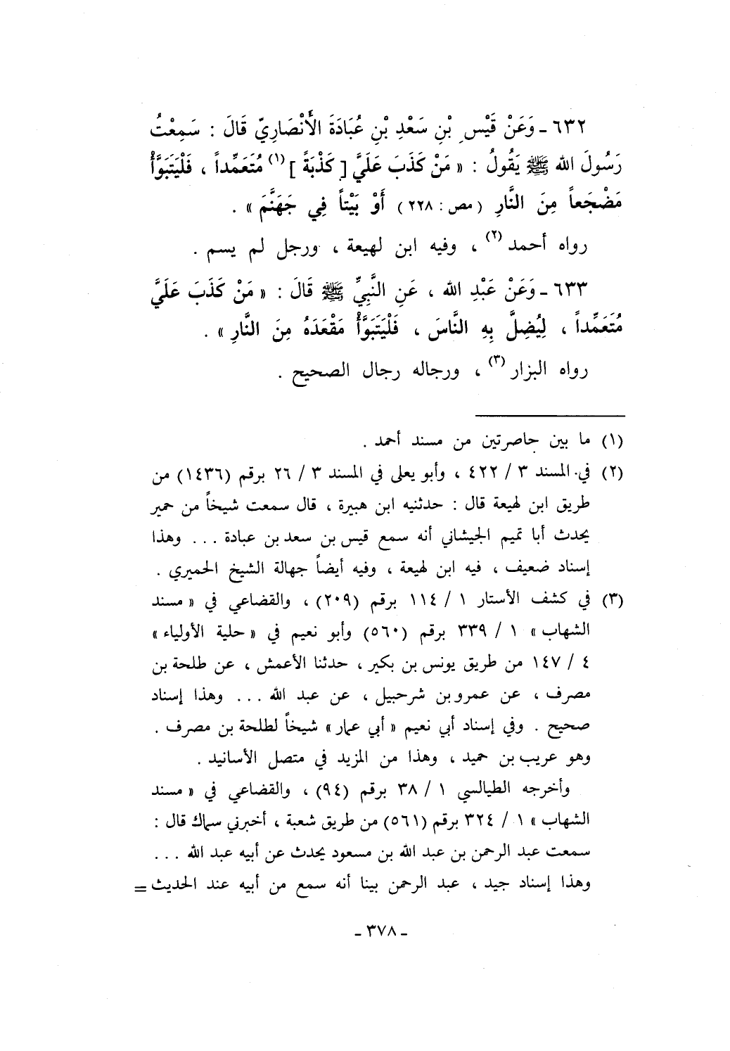 632 - وَعَنْ قَيْسِ بْنِ سَعْدِ بْنِ عُبَادَةَ الأنْصَارِيّ قَالَ: سَمِعْتُ رَسُولَ الله - صلى الله عليه وسلم - يَقُولُ: "مَنْ كَذَبَ عَلَيَّ [كَذْبَةً] (¬1) مُتَعَمِّداً، فَلْيَتَبَوَّأُ مَضْجَعاً مِنَ النَّارِ (مص: 228) أَوْ بَيْتًا في جَهَنَّمَ".