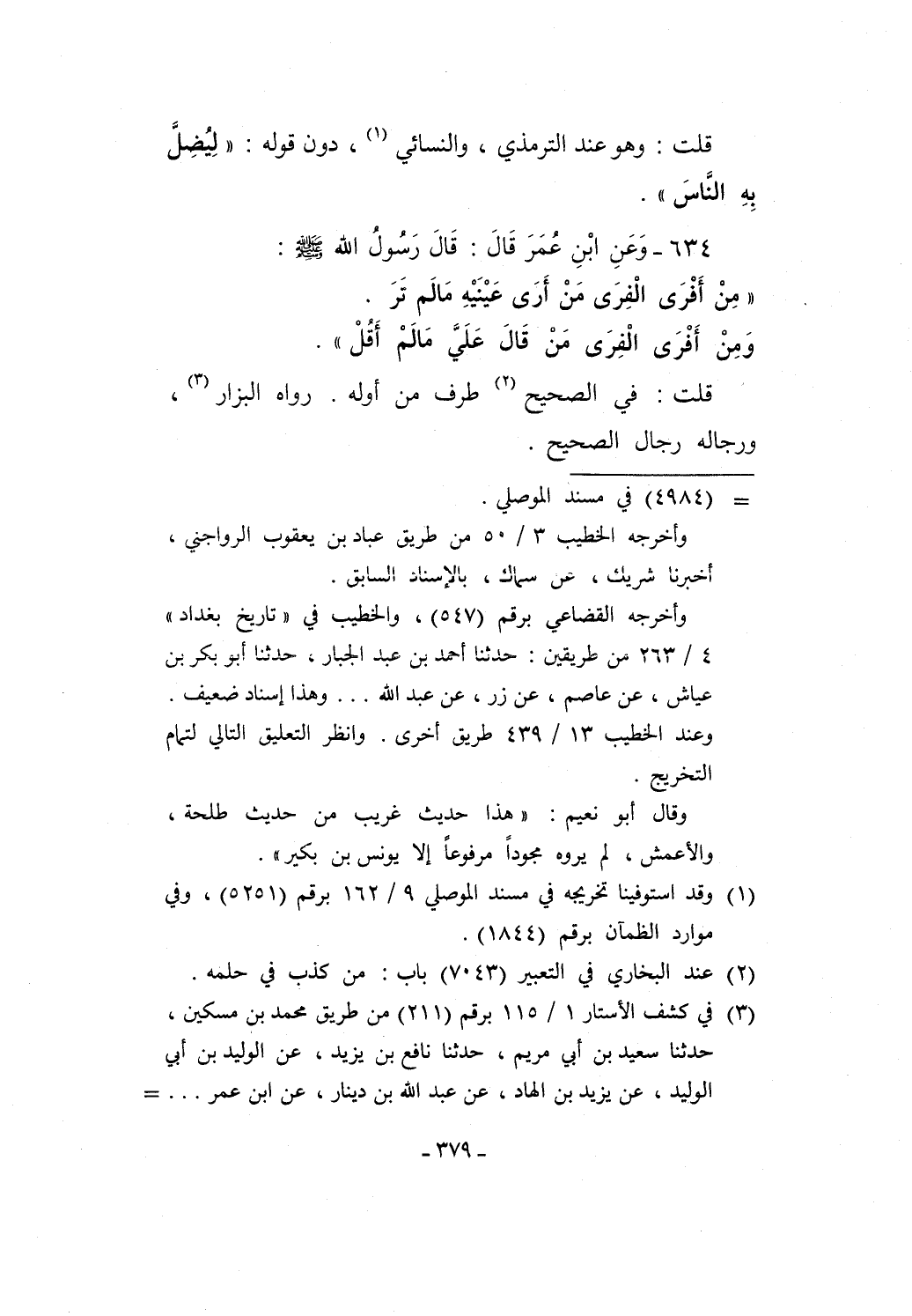 634 - وَعَنِ ابْنِ عُمَرَ قَالَ: قَالَ رَسُولُ الله - صلى الله عليه وسلم -: "مِنْ أَفْرَى الْفِرَى مَنْ أَرَى عَيْنَيْهِ مَا لَمْ تَرَ.