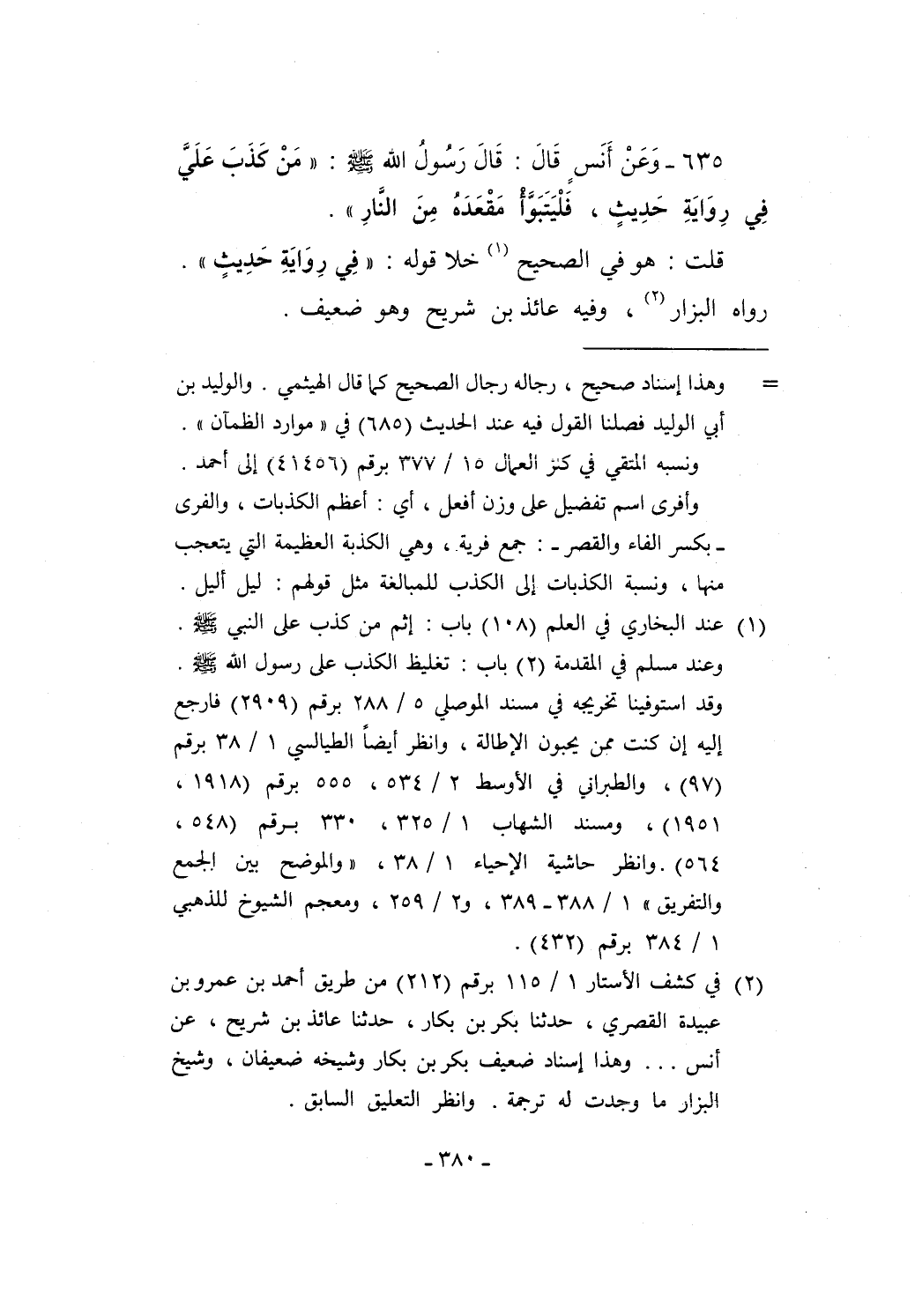 635 - وَعَنْ أَنَسٍ قَالَ: قَالَ رَسُولُ الله - صلى الله عليه وسلم -: "مَنْ كَذَبَ عَلَيَّ في رِوَايَةِ حَدِيثٍ، فَلْيَتَبَوَّأ مَقْعَدَهُ مِنَ النَّارِ".