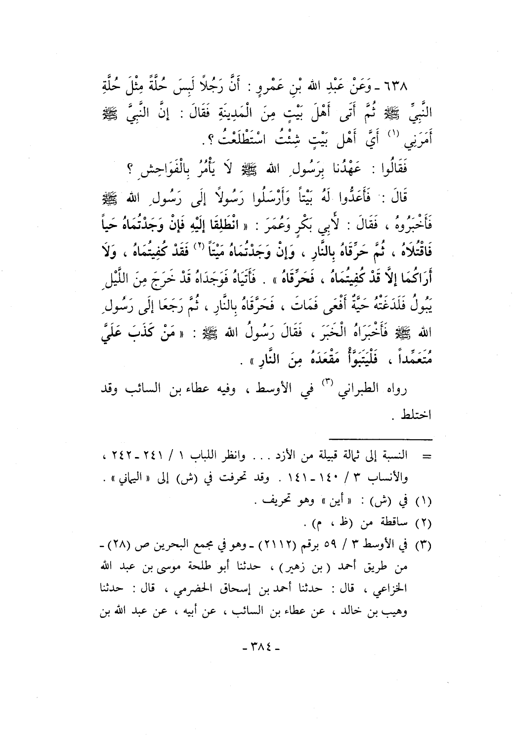 (¬3) في الأوسط 3/ 59 برقم (2112) -وهو في مجمع البحرين ص (28) - من طريق أحمد (بن زهير)، حدثنا أبو طلحة موسى بن عبد الله الخزاعي، قال: حدثنا أحمد بن إسحاق الحضرمي، قال: حدثنا وهيب بن خالد، عن عطاء بن السائب، عن أبيه، عن عبد الله بن