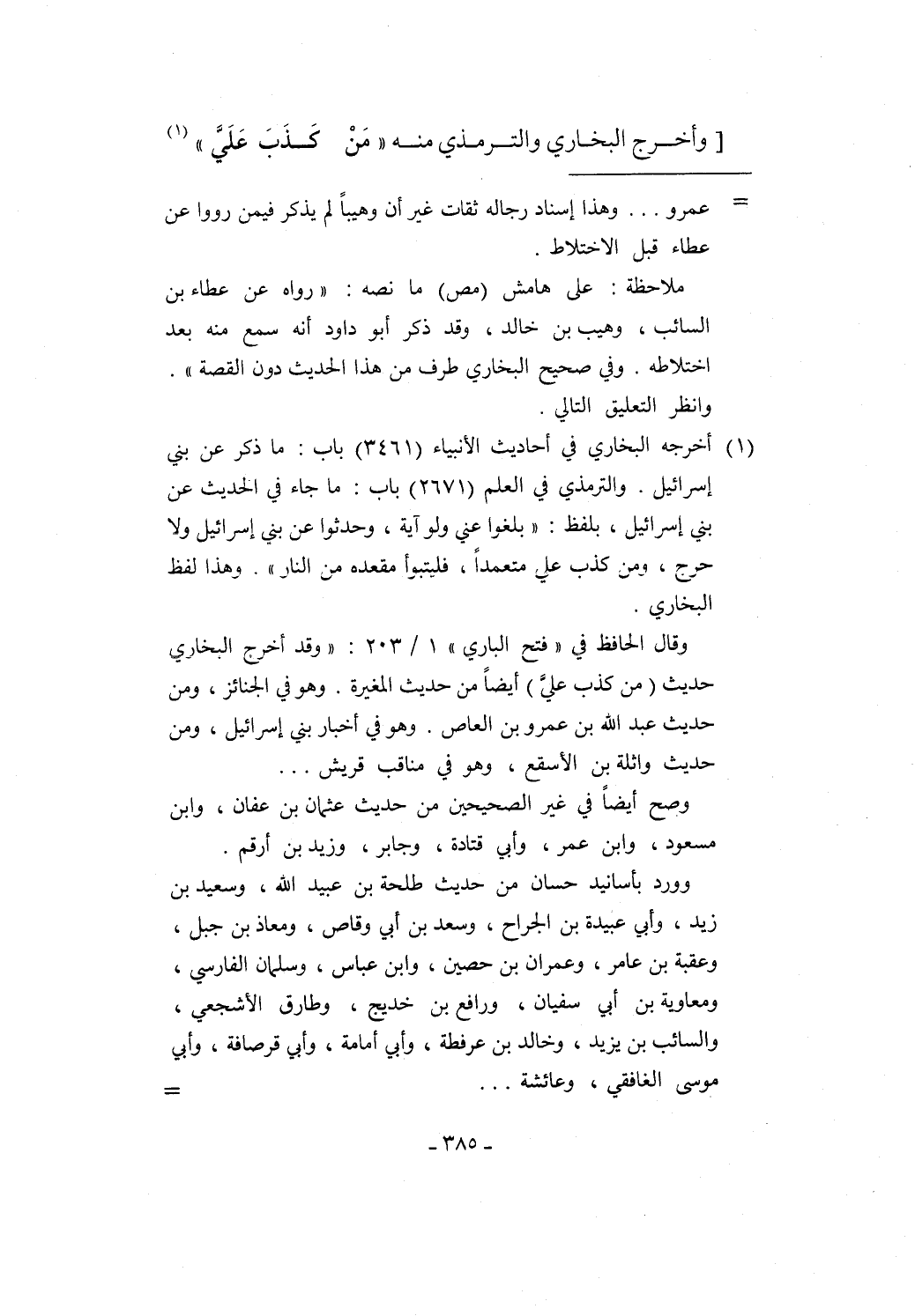 وقال الحافظ في "فتح الباري" 1/ 203: "وقد أخرج البخاري حديث (من كذب عليَّ) أيضاً من حديث المغيرة. وهو في الجنائز، ومن حديث عبد الله بن عمرو بن العاص. وهو في أخبار بني إسرائيل، ومن حديث واثلة بن الأسقع، وهو في مناقب قريش ...