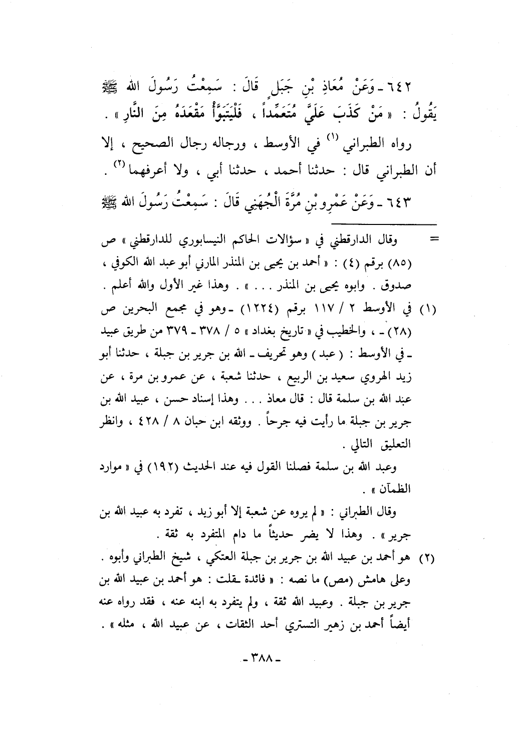 642 - وَعَنْ مُعَاذِ بْنِ جَبَلٍ قَالَ: سَمِعْتُ رَسُولَ الله - صلى الله عليه وسلم - يَقُولُ: "مَنْ كذَبَ عَلَيَّ مُتَعَمِّداً، فَلْيَتَبَوأ مَقْعَدَهُ مِنَ النَّارِ".