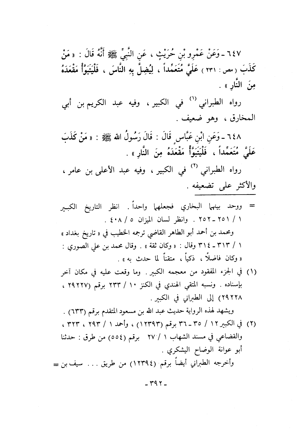 647 - وَعَنْ عَمْرِو بْنِ حُرَيْثٍ، عَنِ النَّبِيِّ - صلى الله عليه وسلم - أَنَّهُ قَالَ: "مَنْ كَذَبَ (مص: 231) عَلَيَّ مُتَعَمِّداً، لِيُضِلَّ بِهِ النَّاسَ، فَلْيَتبَوَّأ مَقْعَدَهُ مِنَ النَّارِ".