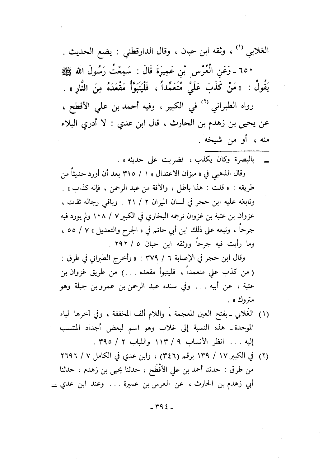 650 - وَعَنِ الْعُرْسِ بْنِ عَمِيرَةَ قَالَ: سَمِعْتُ رَسُولَ الله - صلى الله عليه وسلم - يَقولُ: "مَنْ كَذَبَ عَلَيَّ مُتَعَمِّداً، فَلْيَتَبَوَّأ مَقْعَدَهُ مِنَ النَّارِ".
