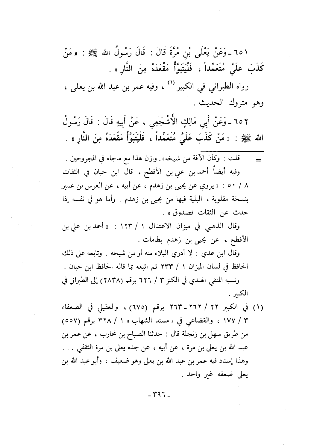 651 - وَعَنْ يَعْلَى بْنِ مُرةَ قَالَ: قَالَ رَسُولُ الله - صلى الله عليه وسلم -: "مَنْ كَذَبَ علَيَّ مُتَعَمِّداً، فَلْيَتَبَوَّأ مَقْعَدَهُ مِنَ النَّارِ".