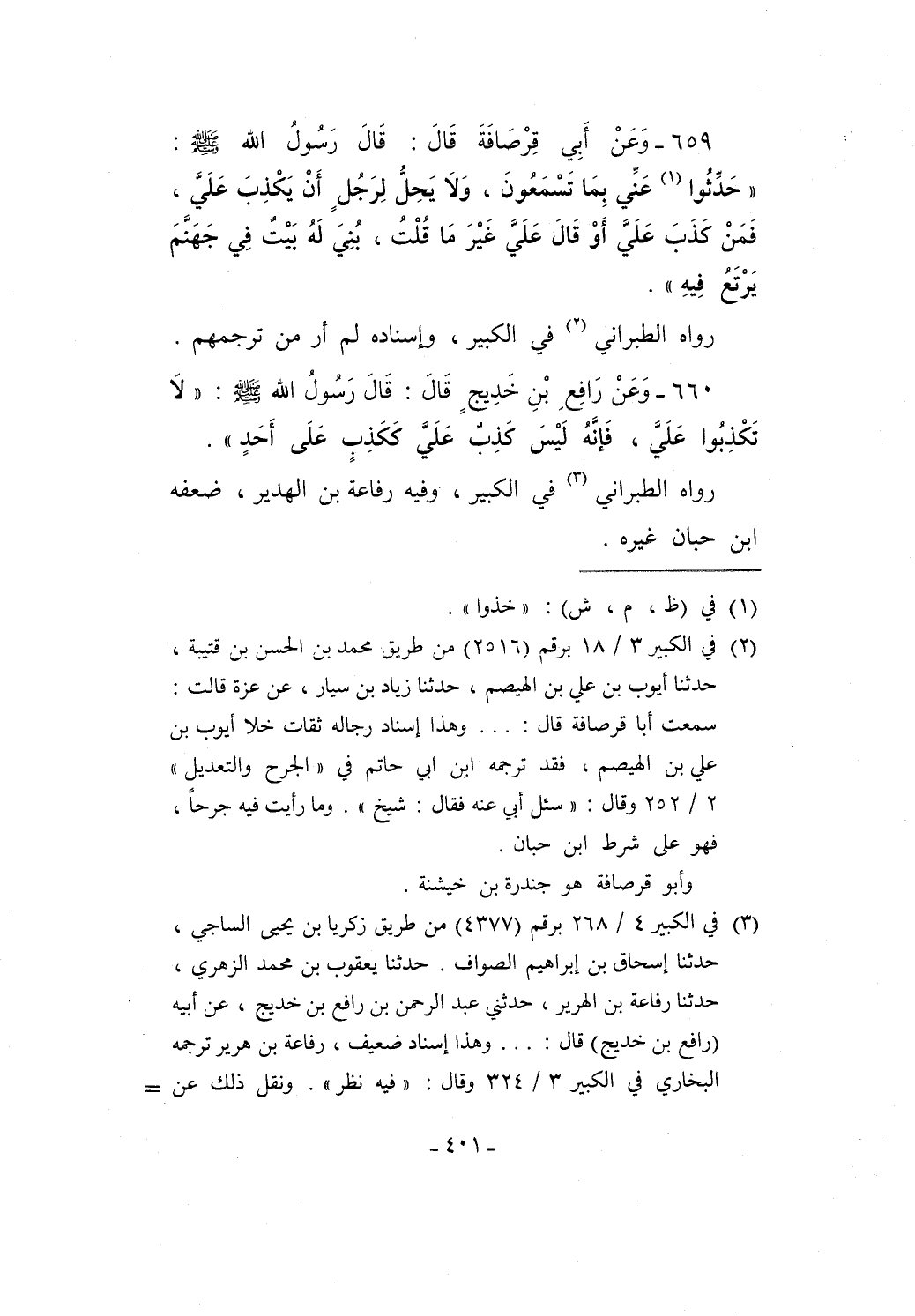 (¬3) في الكبير 4/ 268 برقم (4377) من طريق زكريا بن يحيى الساجي، حدثنا إسحاق بن إبراهيم الصواف. حدثنا يعقوب بن محمد الزهري، حدثنا رفاعة بن الهرير، حدثني عبد الرحمن بن رافع بن خديج، عن أبيه (رافع بن خديج) قال: ... وهذا إسناد ضعيف، رفاعة بن هرير ترجمه البخاري في الكبير 3/ 324 وقال: "فيه نظر". ونقل ذلك عن =