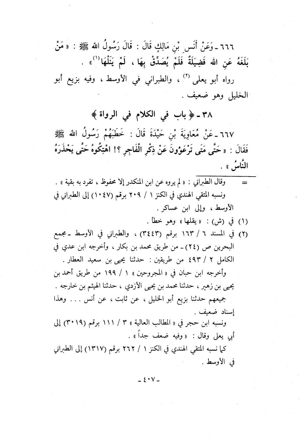 667 - عَنْ مُعَاوِيَةَ بْنِ حَيْدَةَ قَالَ: خَطَبَهُمْ رَسُولُ الله - صلى الله عليه وسلم - فَقَالَ: "حَتَّى مَتَى تَرْعَوُونَ عَنْ ذِكْرِ الْفَاجِرِ؟! اهْتِكُوهُ حَتَّى يَحْذَرَهُ النَّاسُ".