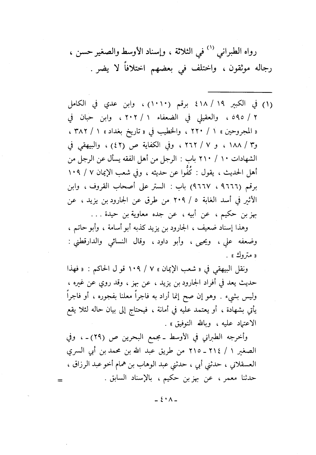 (¬1) في الكبير 19/ 418 برقم (1010)، وابن عدي في الكامل 2/ 595، والعقيلي في الضعفاء 1/ 202، وابن حبان في "المجروحين" 1/ 220، والخطيب في "تاريخ بغداد" 1/ 382، و3/ 188، و7/ 262، وفي الكفاية ص (42)، والبيهقي في الشهادات 10/ 210 باب: الرجل من أهل الفقه يسأل عن الرجل من أهل الحديث، يقول: كُفُّوا عن حديثه، وفي شعب الإيمان 7/ 109 برقم (9666، 9667) باب: الستر على أصحاب القروف، وابن الأثير في أسد الغابة 5/ 209 من طرق عن الجارود بن يزيد، عن بهز بن حكيم، عن أبيه، عن جده معاوية بن حيدة ...