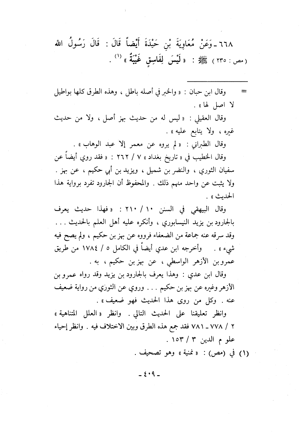 668 - وَعَنْ مُعَاوَيةَ بْنِ حَيْدَةَ أَيْضاً قَالَ: قَالَ رَسُولُ الله - صلى الله عليه وسلم - (مص: 235) - صلى الله عليه وسلم -: "لَيْسَ لِفَاسِقٍ غَيْبَةٌ" (¬1).