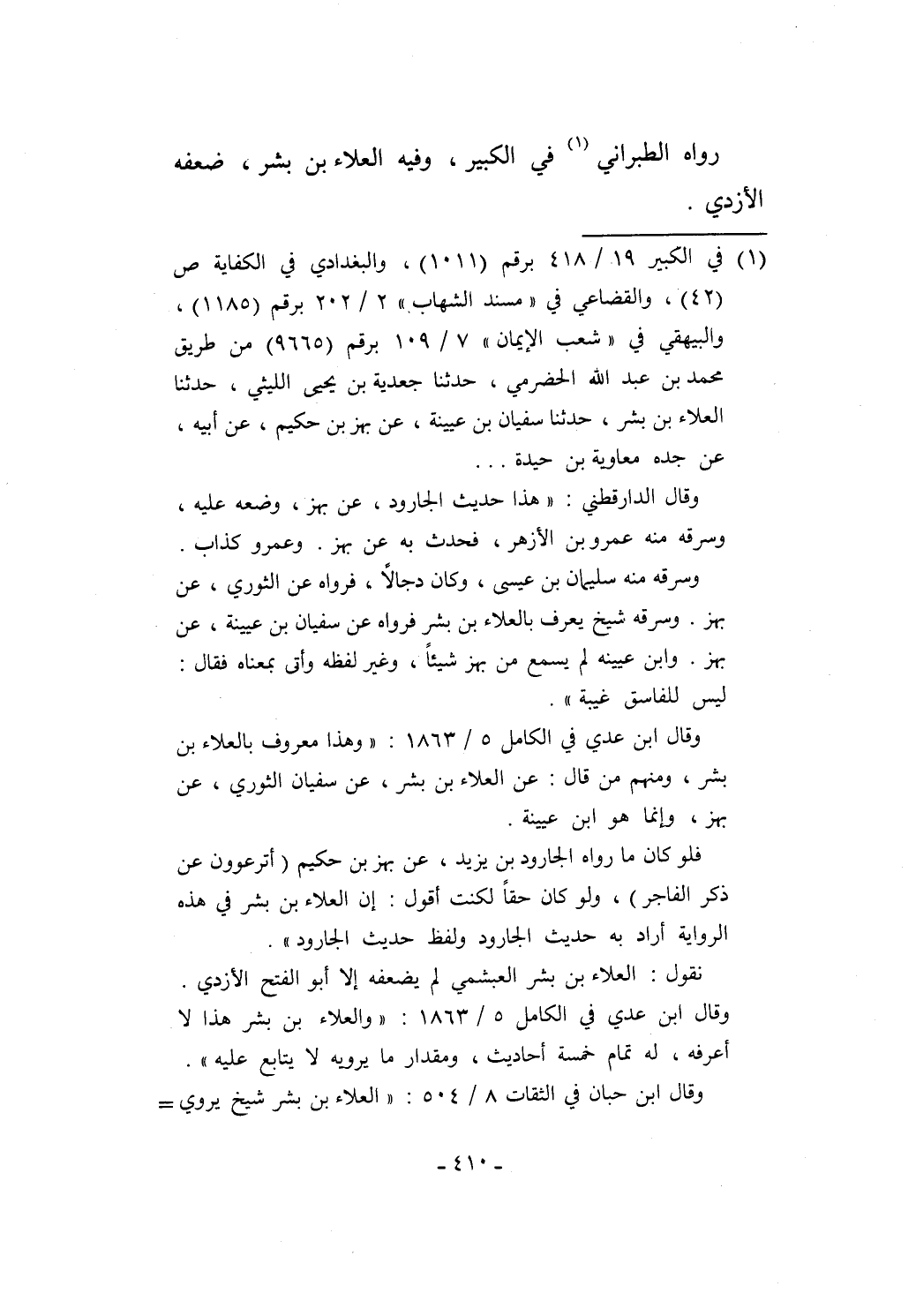 فلو كان ما رواه الجارود بن يزيد، عن بهز بن حكيم (أترعوون عن ذكر الفاجر)، ولو كان حقاً لكنت أقول: إن العلاء بن بشر في هذه الرواية أراد به حديث الجارود ولفظ حديث الجارود".