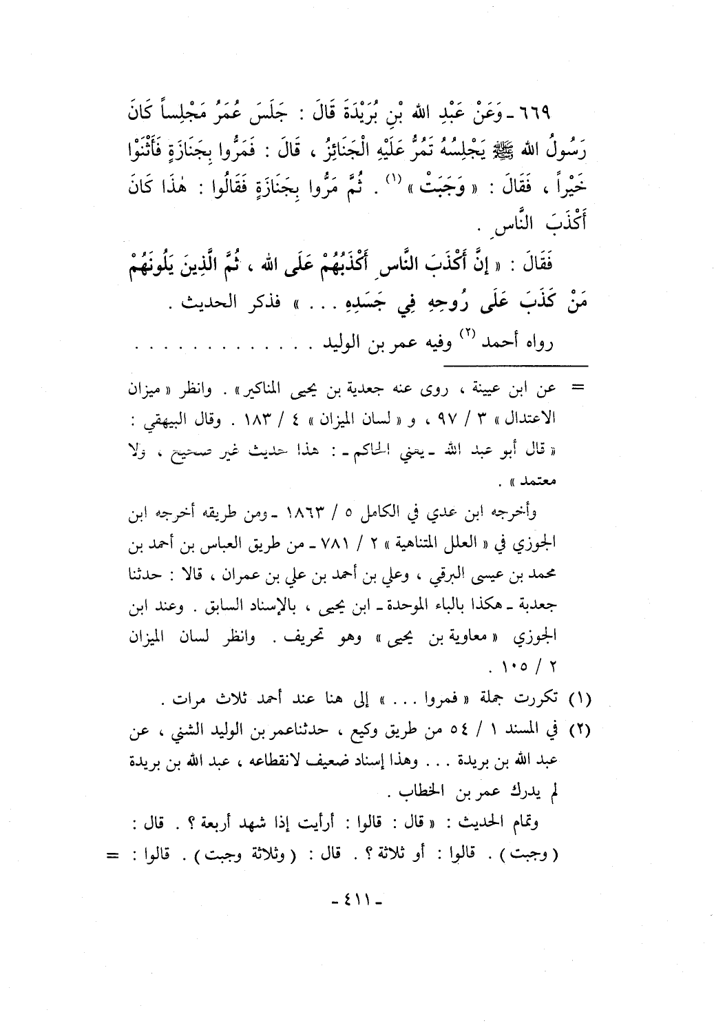669 - وَعَنْ عَبْدِ الله بْنِ بُرَيْدَةَ قَالَ: جَلَسَ عُمَرُ مَجْلِساً كَانَ رَسُولُ الله - صلى الله عليه وسلم - يَجْلِسُهُ تَمُرُّ عَلَيْهِ الْجَنَائِزُ، قَالَ: فَمَرُّوا بِجَنَازَةٍ فَأَثْنَوْا خَيْراً، فَقَالَ: "وَجَبَتْ" (¬1). ثُمَّ مَرُّوا بِجَنَازَةٍ فَقَالُوا: هذَا كَانَ أَكْذَبَ النَّاسِ.