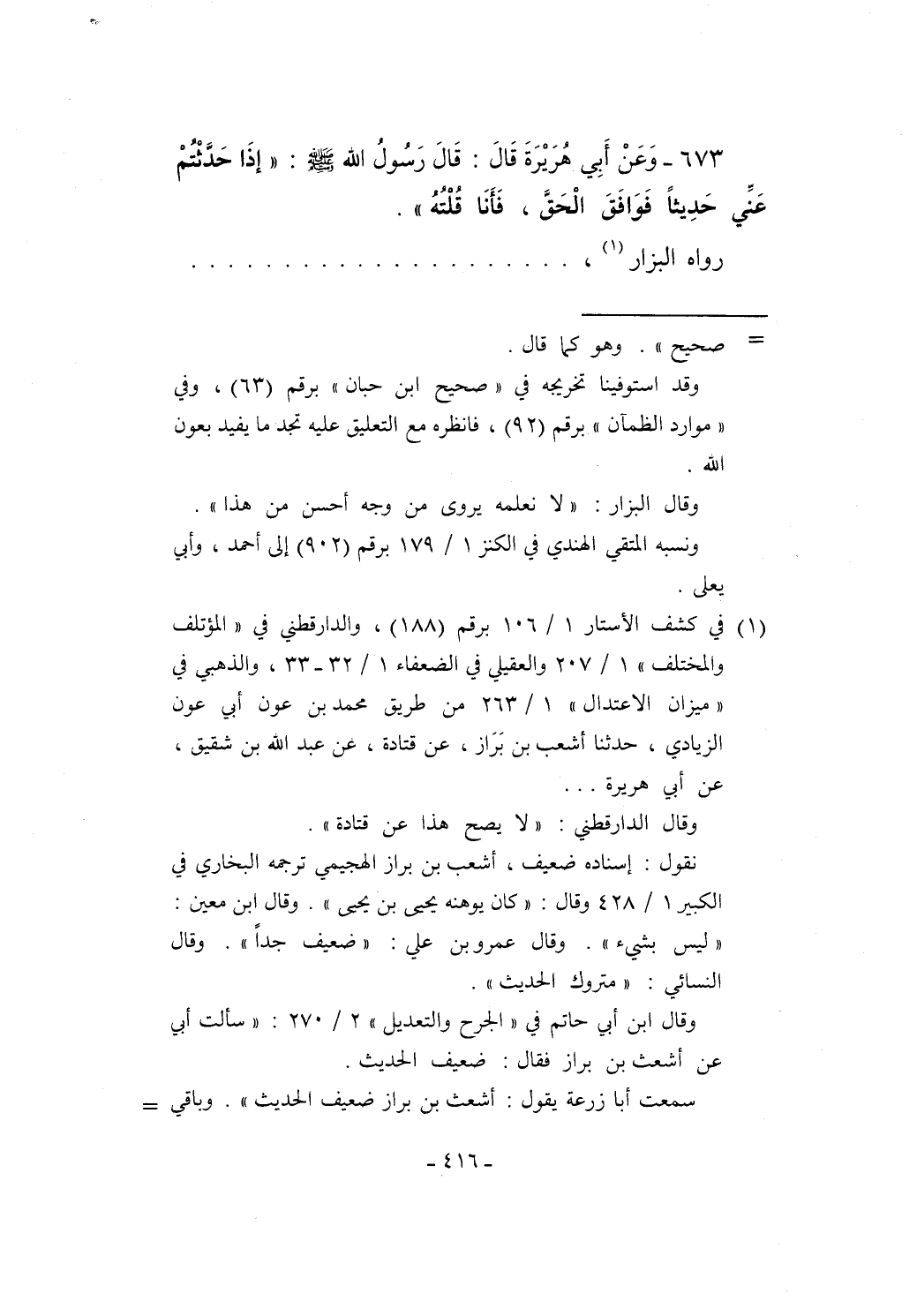 (¬1) في كشف الأستار 1/ 106 برقم (188)، والدارقطني في "المؤتلف والمختلف" 1/ 207 والعقيلي في الضعفاء 1/ 32 - 33، والذهبي في "ميزان الاعتدال" 1/ 263 من طريق محمد بن عون أبي عون الزيادي، حدثنا أشعب بن بَرَاز، عن قتادة، عن عبد الله بن شقيق، عن أبي هريرة ...