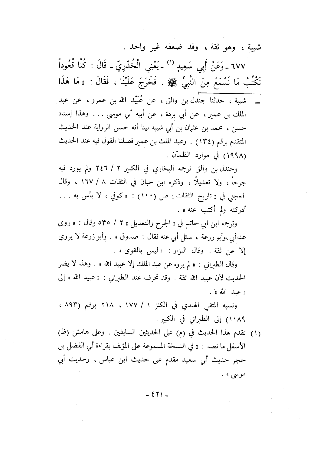 = شيبة، حدثنا جندل بن والق، عن عُبَيْد الله بن عمرو، عن عبد الملك بن عمير، عن أبي بردة، عن أبيه أبي موسى ... وهذا إسناد حسن، محمد بن عثمان بن أبي شيبة بينا أنه حسن الرواية عند الحديث المتقدم برقم (134). وعبد الملك بن عمير فصلنا القول فيه عند الحديث (1998) في موارد الظمآن.