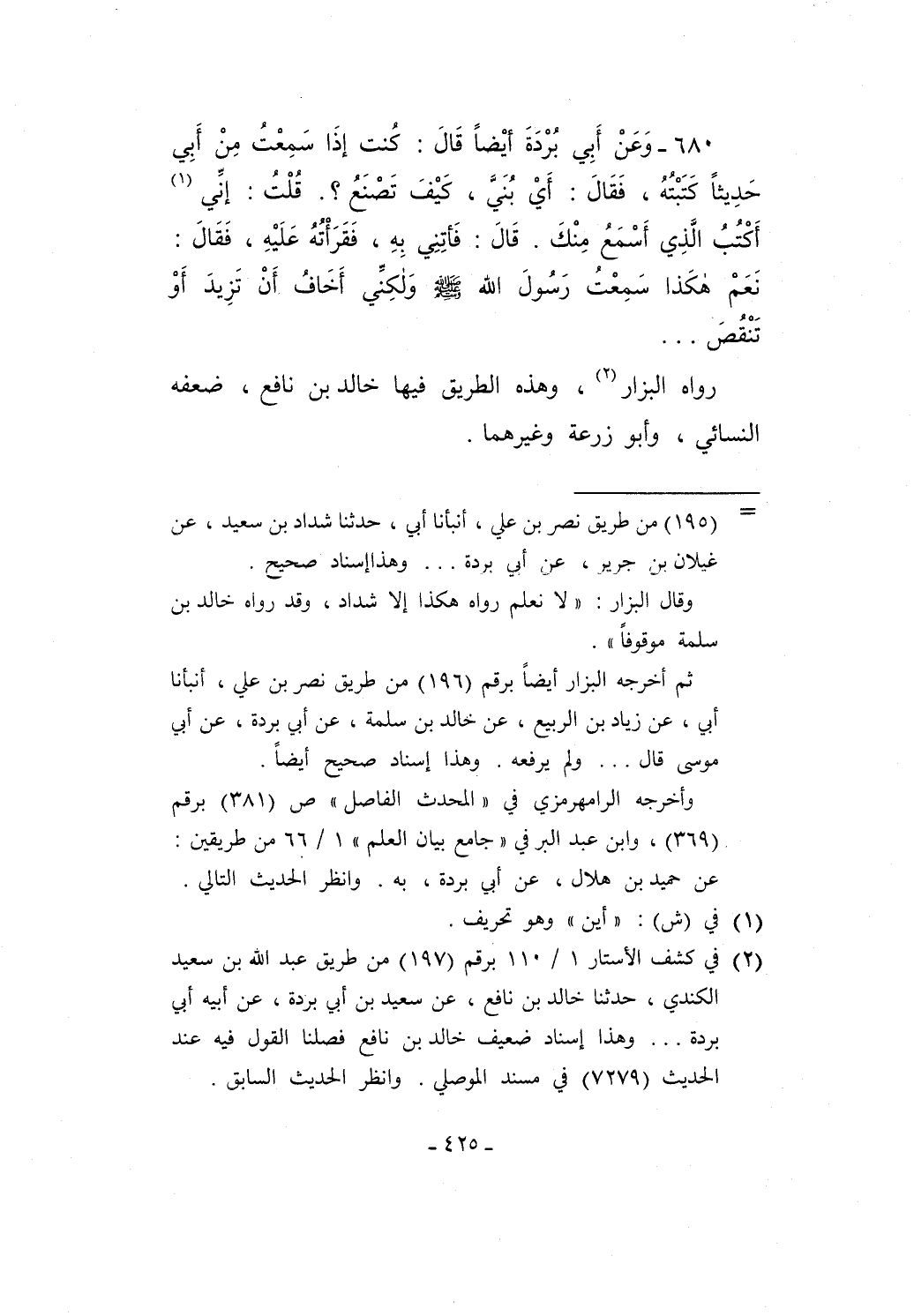 680 - وَعَنْ أَبِي بُرْدَةَ أيْضاً قَالَ: كُنت إذَا سَمِعْتُ مِنْ أَبِي حَدِيثاً كَتَبْتُهُ، فَقَالَ: أَيْ بُنَيَّ، كَيْفَ تَصْنَعُ؟. قُلْتُ: إنِّي (¬1) أَكْتُبُ الَّذِي أَسْمَعُ مِنْكَ. قَالَ: فَأتِنِي بِهِ، فقَرَأْتُهُ عَلَيْهِ، فَقَالَ: نَعَمْ هكَذا سَمِعْتُ رَسُولَ الله - صلى الله عليه وسلم - وَلكِنِّي أَخَافُ أَنْ تَزِيدَ أَوْ تَنْقُصَ ...