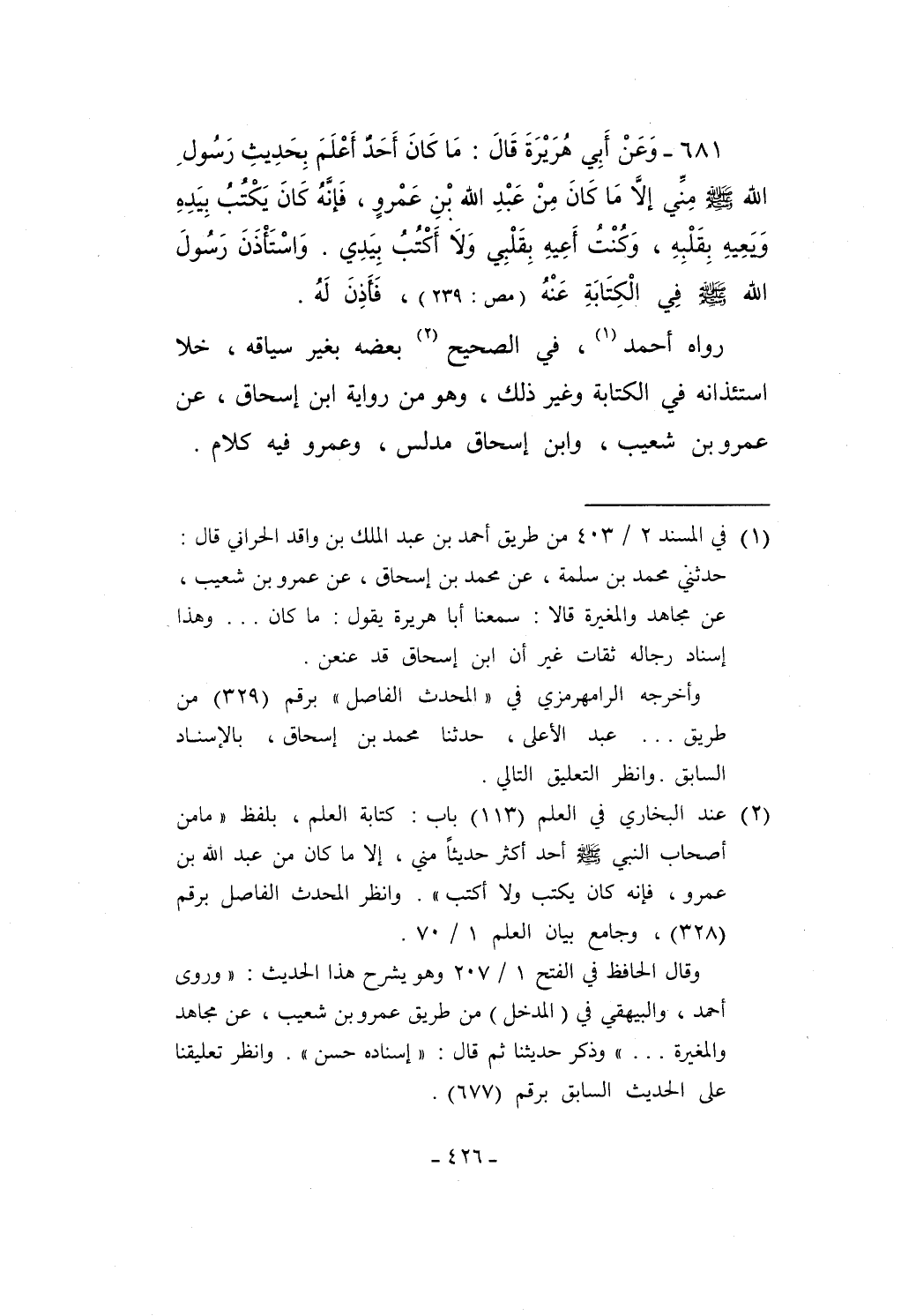 681 - وَعَنْ أَبِي هُرَيْرَةَ قَالَ: مَا كَانَ أَحَدٌ أَعْلَمَ بِحَدِيثِ رَسُولِ الله - صلى الله عليه وسلم - مِنِّي إلاَّ مَا كَانَ مِنْ عَبْدِ الله بْن عَمْروٍ، فَإنَّهُ كَانَ يَكْتُبُ بِيَدِهِ وَيعِيهِ بِقَلْبِهِ، وَكُنْتُ أَعِيهِ بِقَلْبِي وَلاَ أَكْتُبُ بِيَدِي. وَاسْتَأْذَنَ رَسُولَ الله - صلى الله عليه وسلم - في الْكِتَابَةِ عَنْهُ (مص: 239)، فَأَذِنَ لَهُ.
