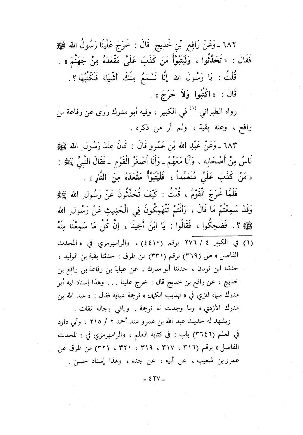 (¬1) في الكبير 4/ 276 برقم (4410)، والرامهرمزي في "المحدث الفاصل" ص (369) برقم (331) من طرق: حدثنا بقية بن الوليد، حدثنا ابن ثوبان، حدثنا أبو مدرك، عن عباية بن رفاعة بن رافع بن خديج، عن رافع بن خديج قال: خرج علينا ... وهذا إسناد فيه أبو مدرك سماه المزي في "تهذيب الكمال" ترجمة عباية فقال: "عبد الله بن مدرك الأزدي" وما وجدت له ترجمة. وباقي رجاله ثقات.