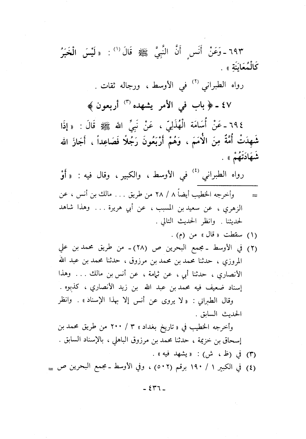 694 - عَنْ أُسَامَة الْهُذَلِيّ، عْنْ نَبِيِّ الله - صلى الله عليه وسلم - قَالَ: "إذَا شَهِدَتْ أُمَّةٌ مِنَ الأمَمِ، وَهُمْ أَرْبَعُونَ رَجُلاً فَصَاعِداً، أَجَازَ الله شَهَادَتَهُمْ".