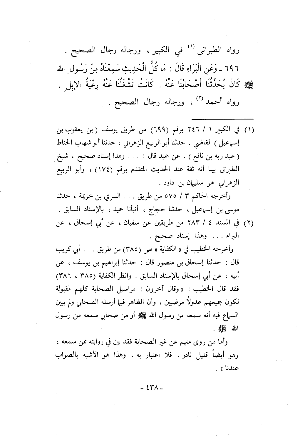 وأخرجه الخطيب في "الكفاية" ص (385) من طريق ... أبي كريب قال: حدثنا إسحاق بن منصور قال: حدثنا إبراهيم بن يوسف، عن أبيه، عن أبي إسحاق بالإسناد السابق. وانظر الكفاية (385، 386) فقد قال الخطيب: "وقال آخرون: مراسيل الصحابة كلهم مقبولة لكون جميعهم عدولاً مرضيين، وأن الظاهر فيما أرسله الصحابي ولم يبين السماع فيه أنه سمعه من رسول الله - صلى الله عليه وسلم - أو من صحابي سمعه من رسول الله - صلى الله عليه وسلم -.