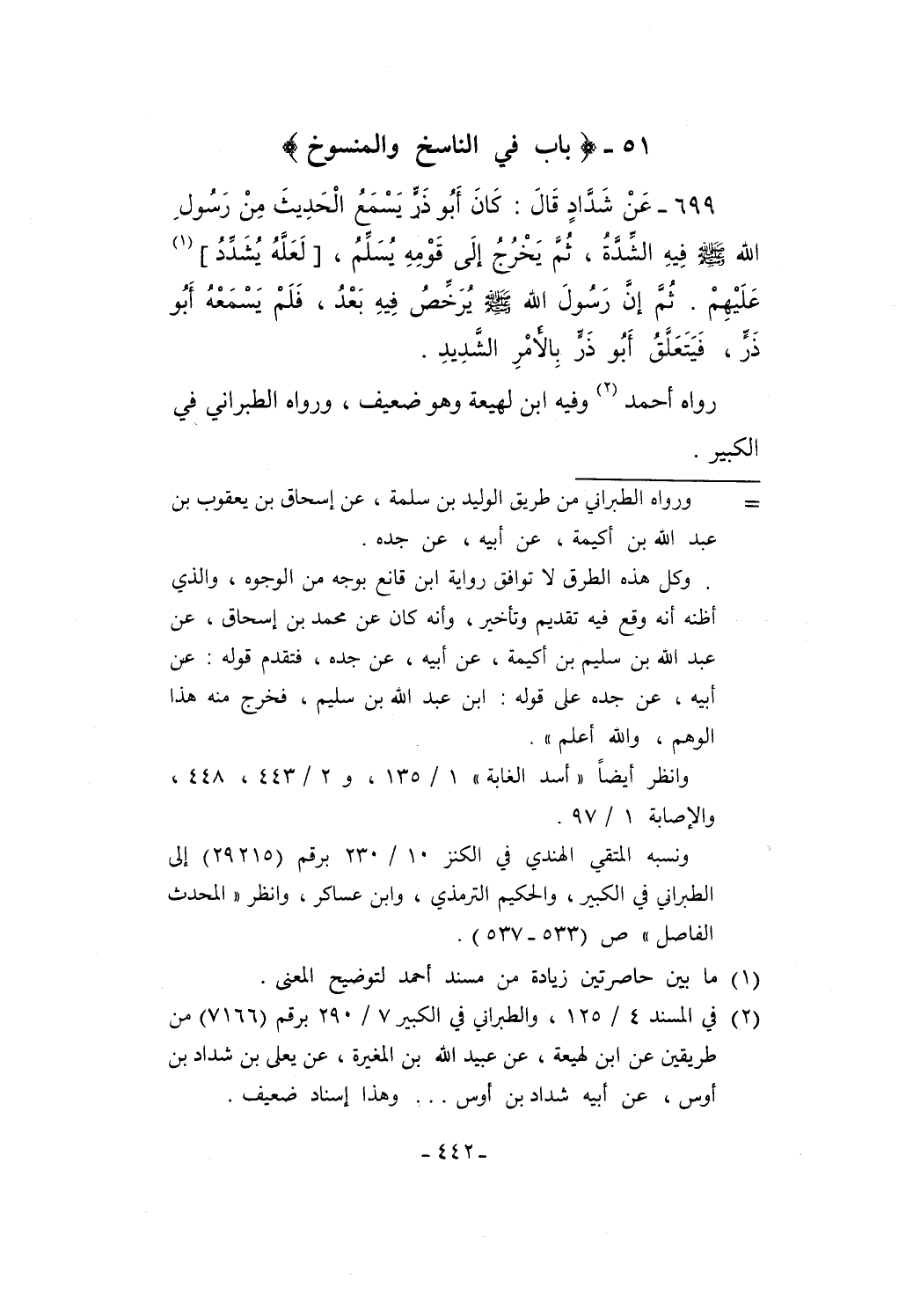 699 - عَنْ شَدَّادٍ قالَ: كَانَ أَبُو ذَرٍّ يَسْمَعُ الْحَدِيثَ مِنْ رَسُولِ الله - صلى الله عليه وسلم - فيهِ الشِّدَّةُ، ثُمَّ يَخْرُجُ إلَى قَوْمِهِ يُسَلِّمُ، [لَعَلَّهُ يُشَدِّدُ] (¬1) عَلَيْهِمْ. ثُمَّ إنَّ رَسُولَ الله - صلى الله عليه وسلم - يُرَخِّصُ فِيهِ بَعْدُ، فَلَمْ يَسْمَعْهُ أَبُو ذَرٍّ، فَيَتَعَلَّقُ أَبُو ذَرٍّ بِالأمْرِ الشَّدِيدِ.