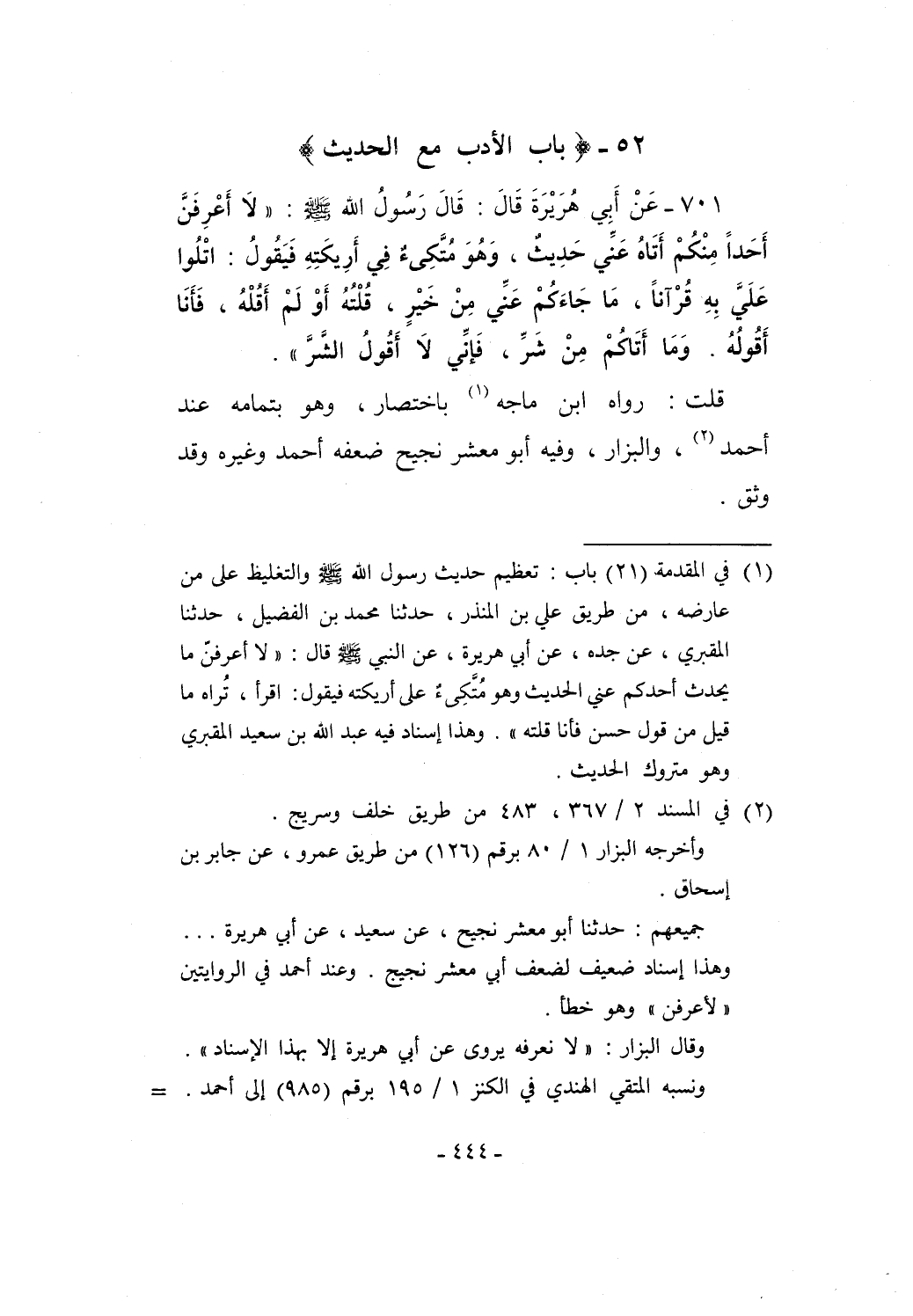 (¬1) في المقدمة (21) باب: تعظيم حديث رسول الله - صلى الله عليه وسلم - والتغليظ على من عارضه، من طريق علي بن المنذر، حدثنا محمد بن الفضيل، حدثنا المقبري، عن جده، عن أبي هريرة، عن النبي - صلى الله عليه وسلم - قال: "لا أعرفنّ ما يحدث أحدكم عني الحديث وهو مُتَّكِئٌ على أريكته فيقول: اقرأ، تُراه ما قيل من قول حسن فأنا قلته". وهذا إسناد فيه عبد الله بن سعيد المقبري وهو متروك الحديث.