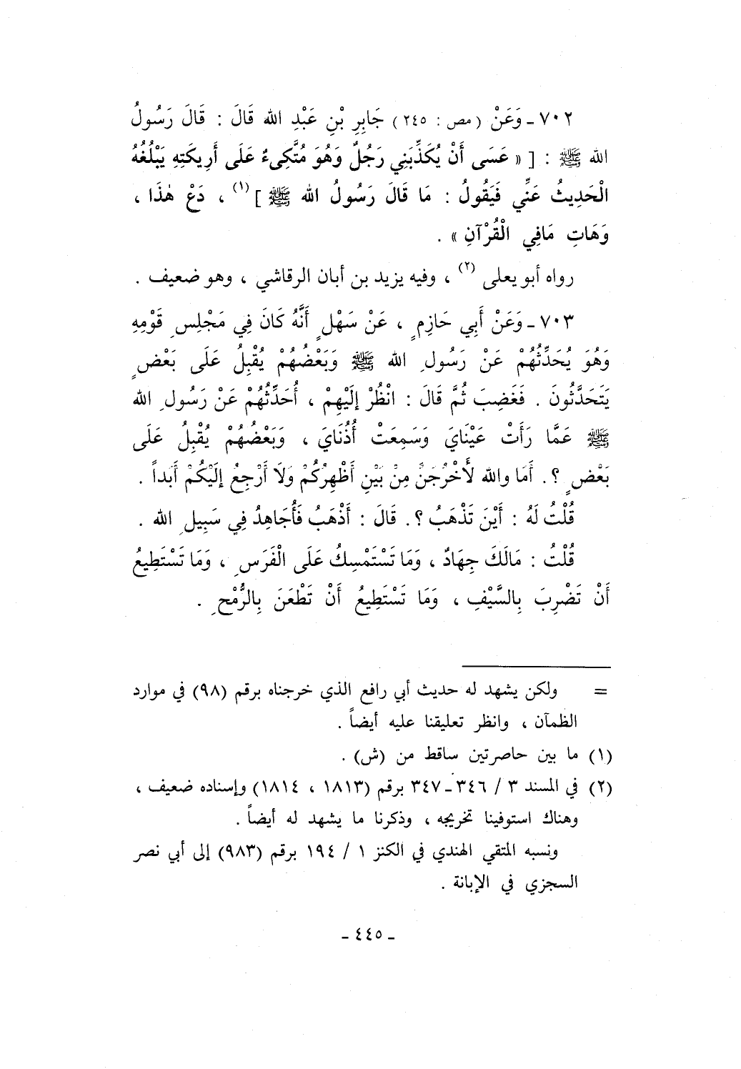702 - وَعَنْ (مص: 245) جَابِرِ بْنِ عَبْدِ الله قَالَ: قَالَ رَسُولُ الله - صلى الله عليه وسلم -: ["عَسَى أَنْ يُكَذِّبَنِي رَجُلٌ وَهُوَ مُتَّكِئٌ عَلَى أَرِيكَتِهِ يَبْلُغُهُ الْحَدِيثُ عَنِّي فَيَقُولُ: مَا قَالَ رَسُولُ الله - صلى الله عليه وسلم -] (¬1)، دَعْ هذَا، وَهَاتِ مَا في الْقُرْآنِ".