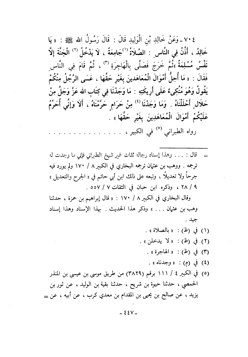 704 - وَعَنْ خَالِدِ بْنِ الْوَلِيدِ قَالَ: قَالَ رَسُولُ الله - صلى الله عليه وسلم -: "يَا خَالِدُ، أَذِّنْ في النَّاسِ: الصَّلاَةُ (¬1) جَامِعَةٌ، لاَ يَدْخُلُ (¬2) الْجَنَّةَ إلاَّ نَفْسٌ مُسْلِمَةٌ" ثُمَّ خَرَجَ فَصَلَّى بِالْهَاجِرَةِ (¬3)، ثُمَّ قَامَ في النَّاسِ فَقَالَ: "مَا أُحِلُّ أَمْوَالَ الْمُعَاهَدينَ بِغَيْرِ حَقِّهَا، عَسَى الرَّجُلُ مِنْكُمْ يَقُولُ وَهُوَ مُتَّكِئٌ عَلَى أَرِيكَتِهِ: مَا وَجَدْنَا في كِتَابِ الله عَزَّ وَجَلَّ مِنْ حَلاَلٍ أَحْلَلْنَاهُ. وَمَا وَجَدْنَا (¬4) مِنْ حَرَامٍ حَرَّمْنَاهُ، أَلاَ وَإنِّي أُحَرِّمُ عَلَيْكُمْ أَمْوَالَ الْمُعَاهَدِينَ بِغَيْرِ حَقِّهَا".