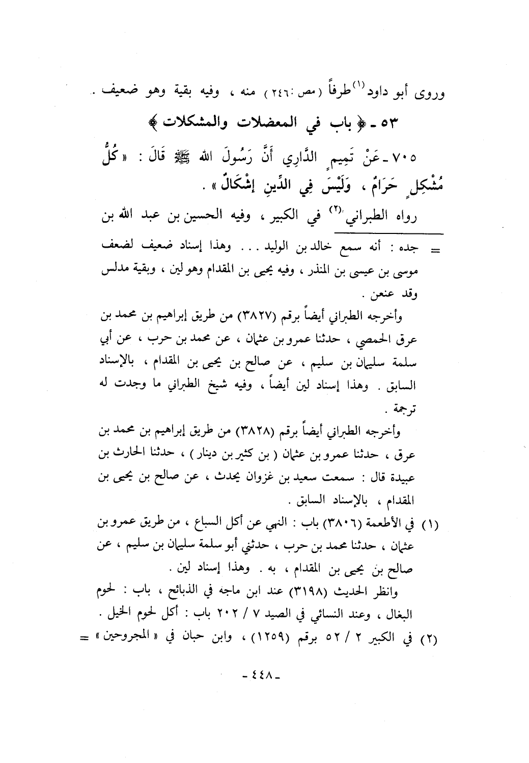 705 - عَنْ تَمِيمٍ الدَّارِي أَنَّ رَسُولَ الله - صلى الله عليه وسلم - قَالَ: "كُلُّ مُشْكِلٍ حَرَامٌ، وَلَيْسَ في الدِّينِ إشْكَالٌ".
