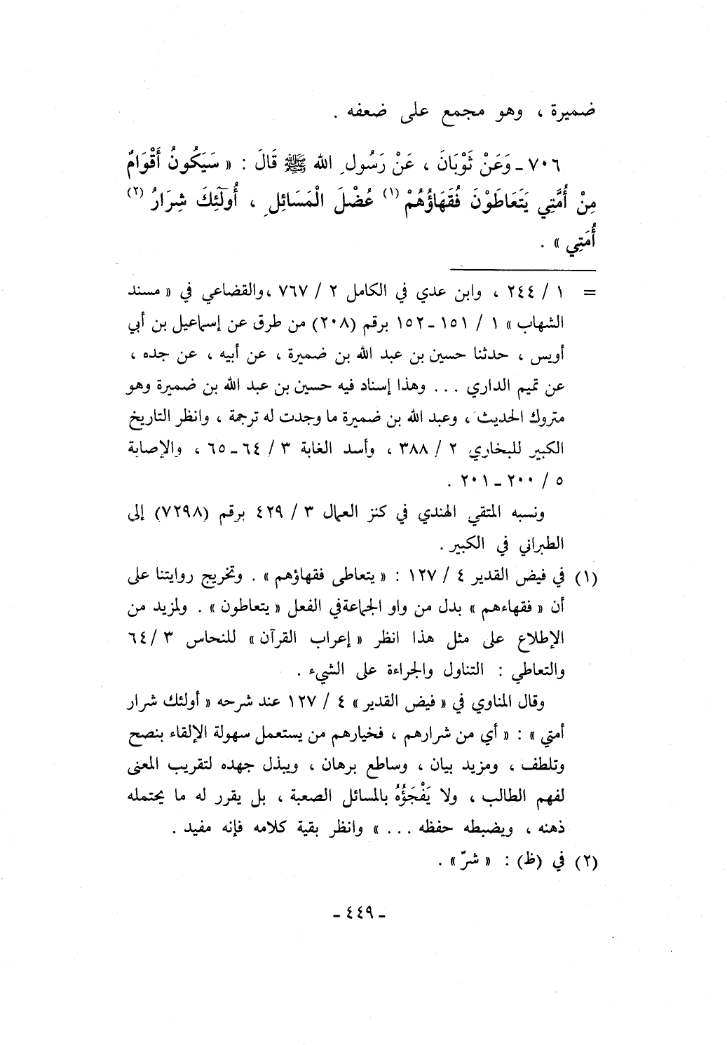 706 - وَعَنْ ثَوْبَانَ، عَنْ رَسُولِ الله - صلى الله عليه وسلم - قَالَ: "سَيَكُونُ أَقْوَامٌ مِنْ أُمَّتِي يَتَعَاطَوْنَ فُقَهَاؤُهُمْ (¬1) عُضْلَ الْمَسَائِلِ، أُولَئِكَ شرَارُ (¬2) أُمَتِي".