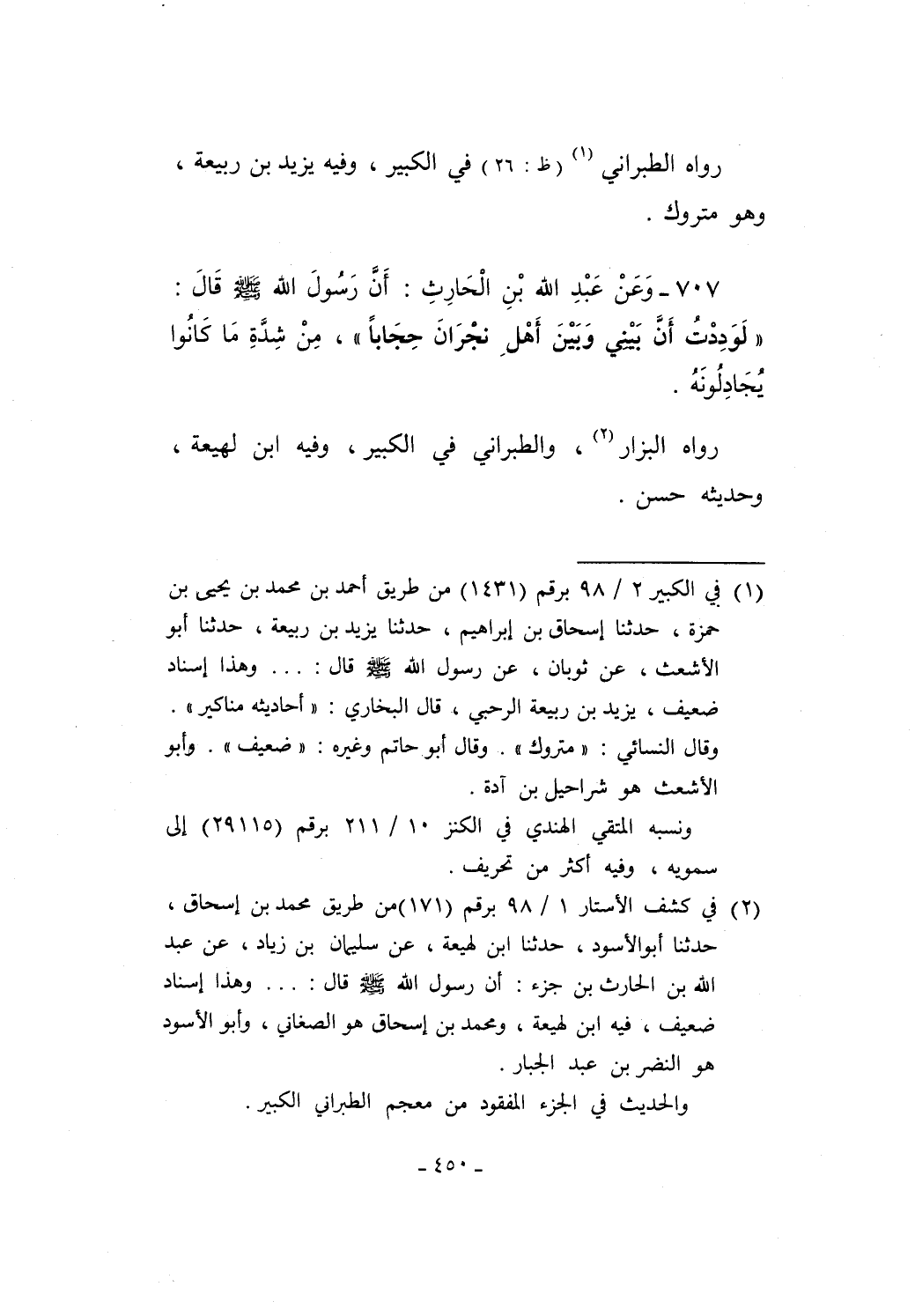 (¬2) في كشف الأستار 1/ 98 برقم (171) من طريق محمد بن إسحاق، حدثنا أبو الأسود، حدثنا ابن لهيعة، عن سليمان بن زياد، عن عبد الله بن الحارث بن جزء: أن رسول الله - صلى الله عليه وسلم - قال: ... وهذا إسناد ضعيف، فيه ابن لهيعة، ومحمد بن إسحاق هو الصغاني، وأبو الأسود هو النضر بن عبد الجبار.