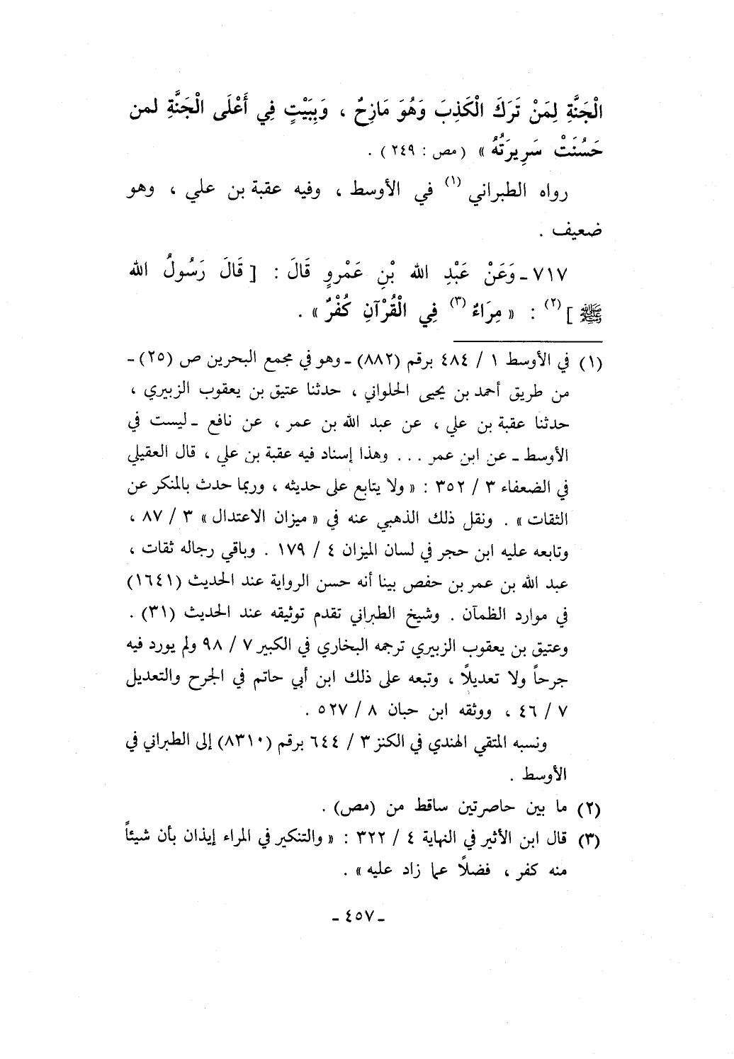 717 - وَعَنْ عَبْدِ الله بْنِ عَمْروٍ قَالَ: [قَالَ رَسُولُ الله - صلى الله عليه وسلم -، (¬2): "مِرَاءٌ (¬3) في الْقُرْآنِ كُفْرٌ".