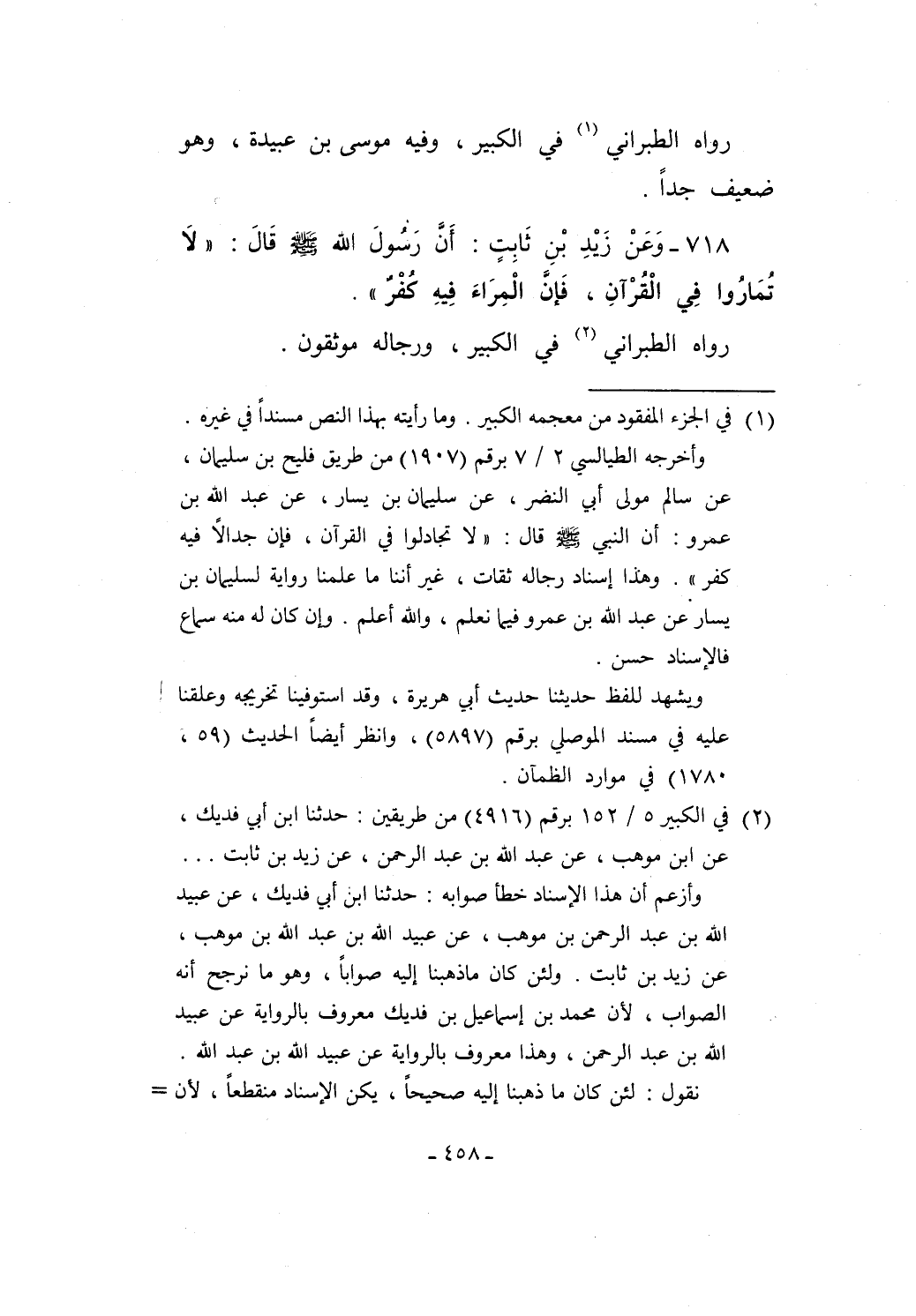 718 - وَعَنْ زَيْدِ بْنِ ثَابِتٍ: أَنَّ رَسُولَ الله- قَالَ: "لاَ تُمَارُوا في الْقُرْآنِ، فَإنَّ الْمِرَاءَ فِيهِ كُفْرٌ".
